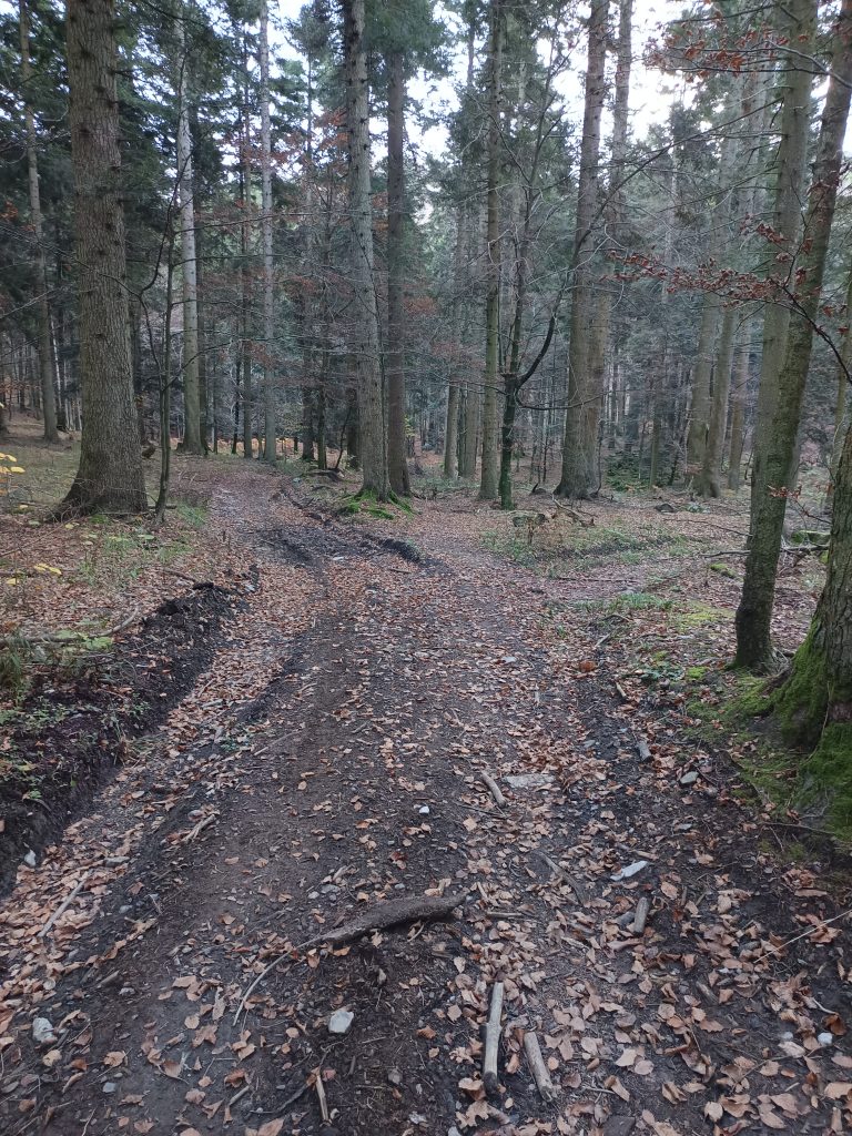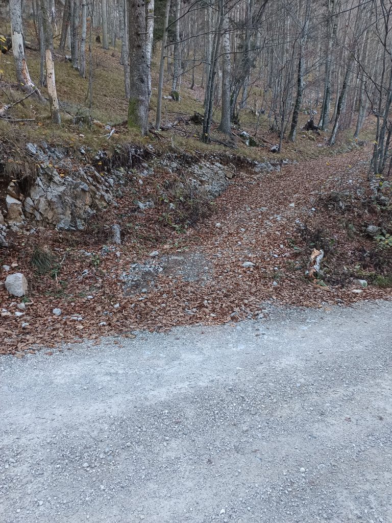 Tu zapustimo gozdno cesto in vzpon nadaljujemo desno po markiranem kolovozu.