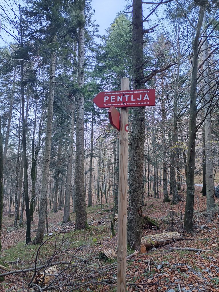 Nekaj minut naprej prispemo do mesta, kjer cesta preči markirano pot oziroma kolovoz, ki vodi od Lovske koče Plehanov laz proti Krimu in je tudi tabla Pentlja.