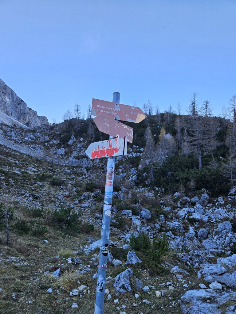 Med potjo imamo dve razgledni točki. Po dobre pol ure pridemo do razpotja, kjer nas table levo vodijo do Male Mojstrovke po Hanzovi poti, mi nadaljujemo desno proti Slemenovi špici in Tamarju. Do Slemena bi prišli tudi po drugi – Hanzovi poti, vendar je priporočljivo imeti čelado in je nebi priporočala za obisk z otroki in psi, ki niso navajeni skalnatih poti. Če pa se odločimo za Hanzovo pot, lahko naredimo krožno turo.