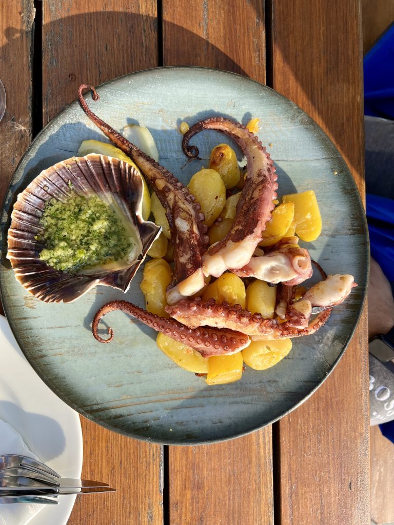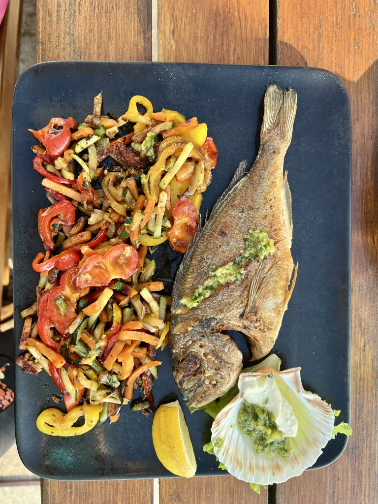 Izbirate lahko med več različnimi morskimi dobrotami. Midva sva poskusila hobotnico na žaru s krompirjem, orado na žaru s popečeno zelenjavo in drugi dan sardelce z zelnjavo.