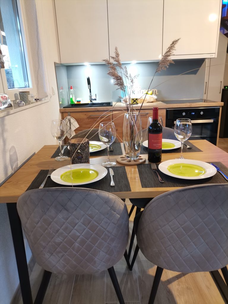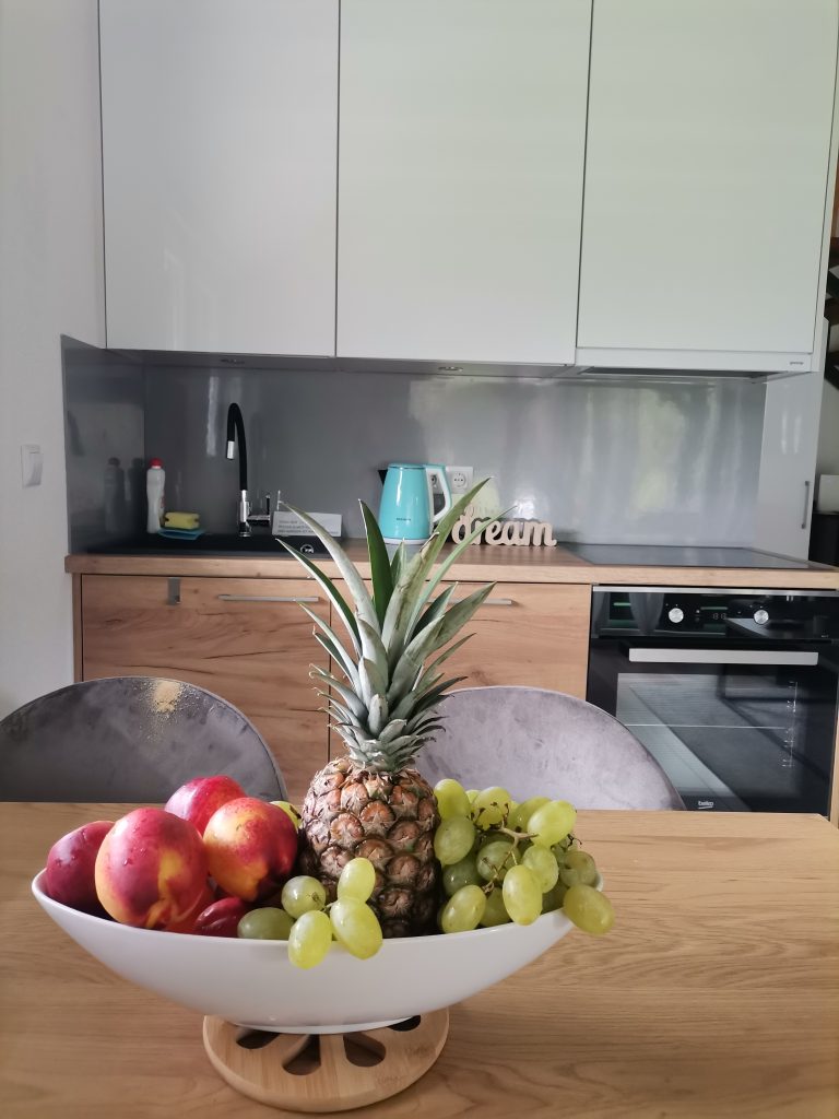 Popolnoma opremljena kuhinja ima vse potrebne pripomočke, kot so jedilni pribor, posoda in različni kuhinjski pripomočki, ki jih potrebujete za pripravo okusnih jedi. Domače obroke lahko uživate na prostem na terasi, ki je opremljena s kakovostnim vrtnim pohištvom. Kopalnica je moderno opremljena in ima tuš kabino, umivalnik z ogledalom, obešalo za brisače. Prijetna dnevna soba vabi k sprostitvi na udobnem kavču in kaminu na pelete ter nudi dovolj prostora za družabne večere. Spalnica je opremljena z visokokakovostno vzmetnico in posteljnino. Imajo celo balkon, kjer lahko uživate v svežem zraku in slikoviti okolici.