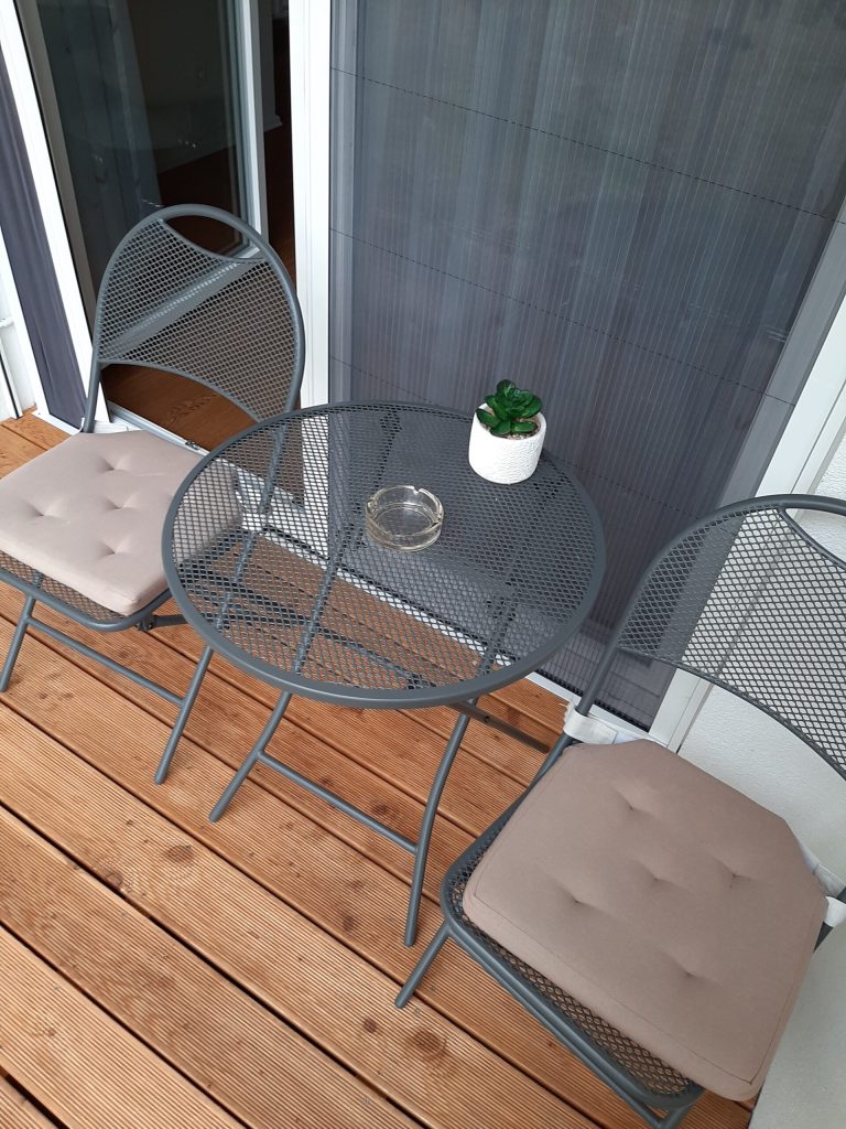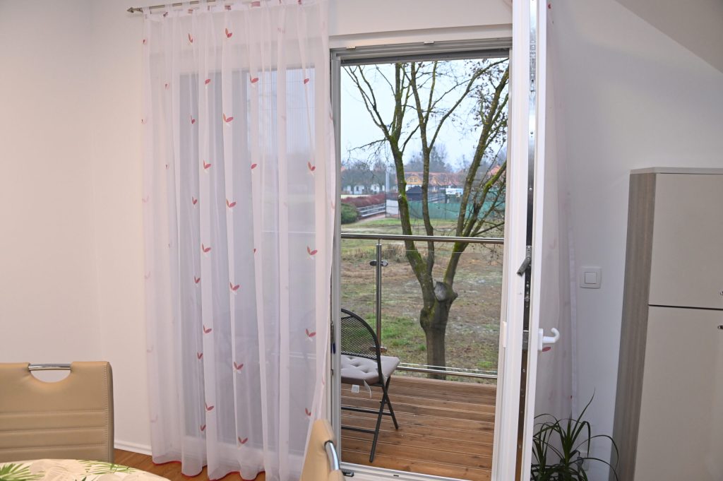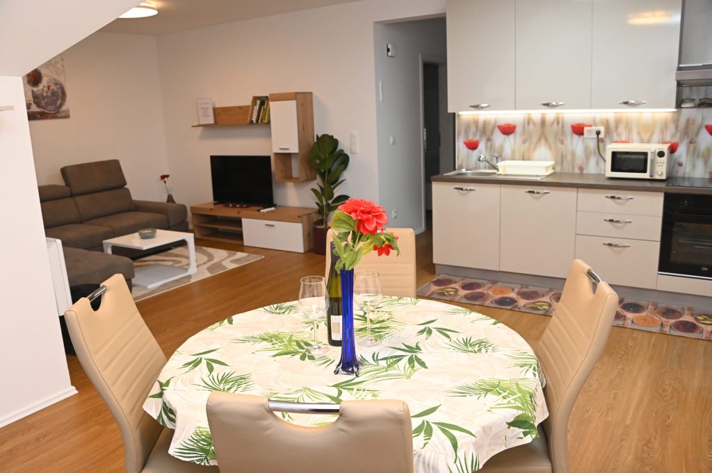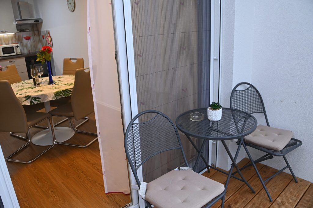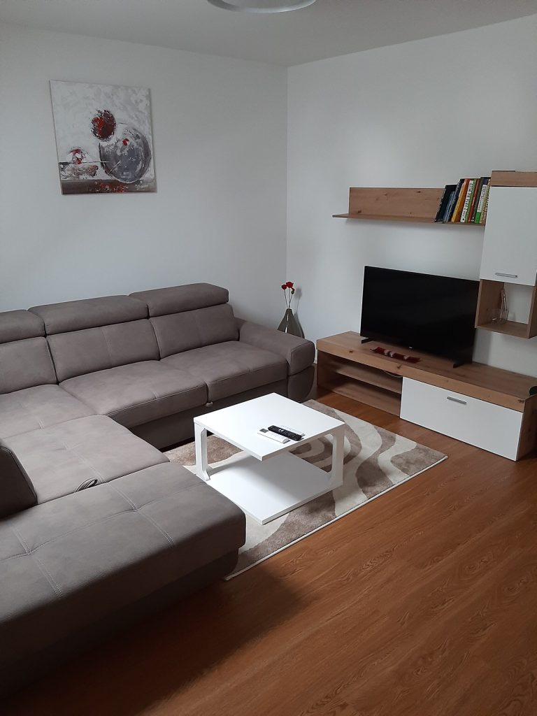 Dnevna soba ponuja udoben kavč, ki ga je mogoče raztegniti v ležišče za dve osebi, ter velik TV sprejemnik z najnovejšimi funkcijami za prijetno večerno sprostitev. Na balkonu lahko uživate z vašim kužkom v mirnem večeru ali jutranji kavi.