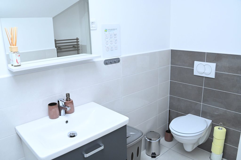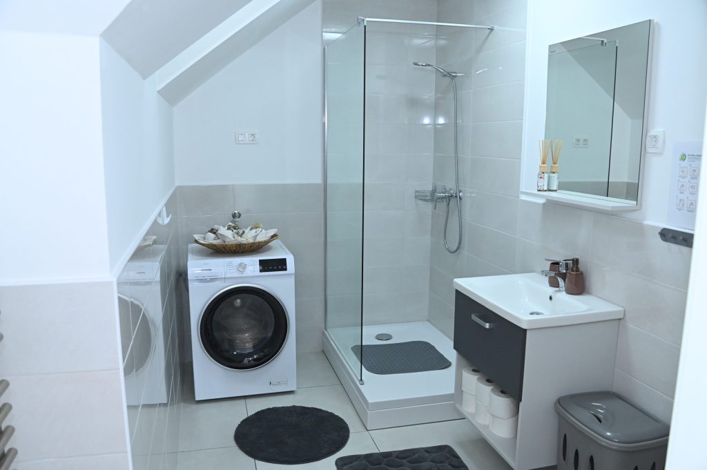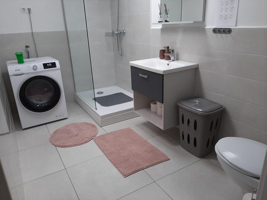Vključena je tudi posteljnina. Lahko uporabite otroško posteljico za otroke do 2 let. Kopalnica je moderno opremljena, z veliko tuš kabino. Na voljo imate brisače in sušilec za lase. V kopalnici je tudi pralno sušilni stroj.