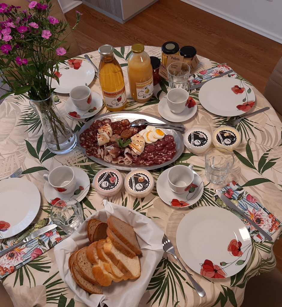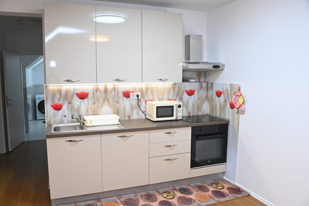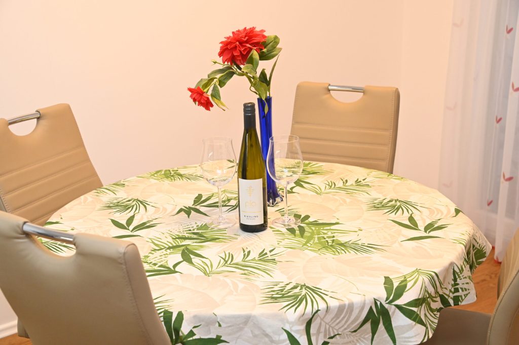Vsem gostom so na voljo hišni copati, ki so pred vašim prihodom sveže oprani. Kuhinja je popolnoma opremljena z indukcijsko ploščo, pomivalnim strojem, mikrovalovno pečico, vso potrebno kuhalno posodo, krožniki, priborom in osnovnimi začimbami za pripravo okusnih obrokov. Dodatno lahko naročite okusen zajtrk.