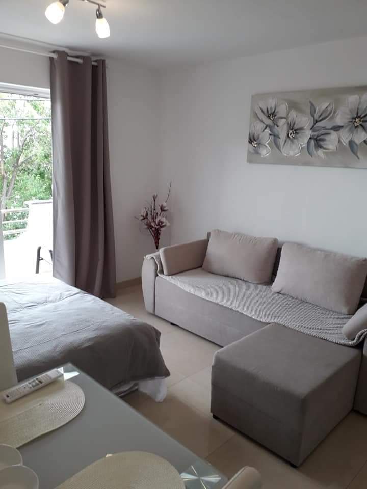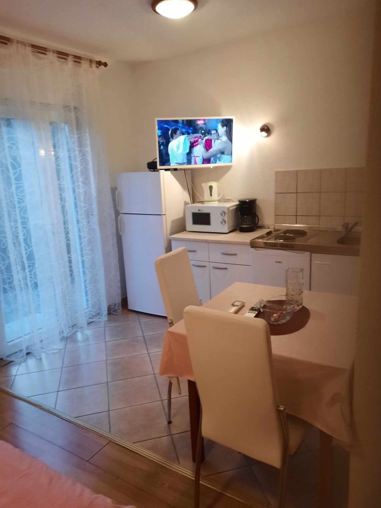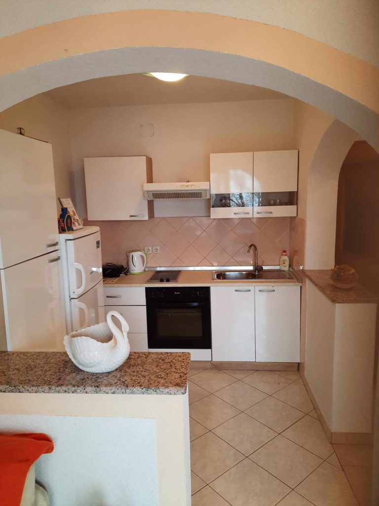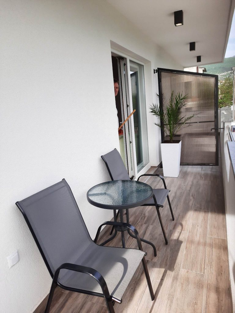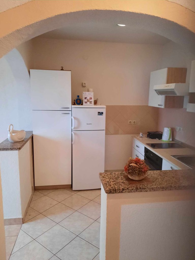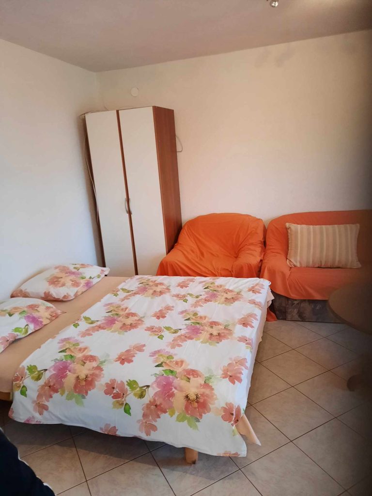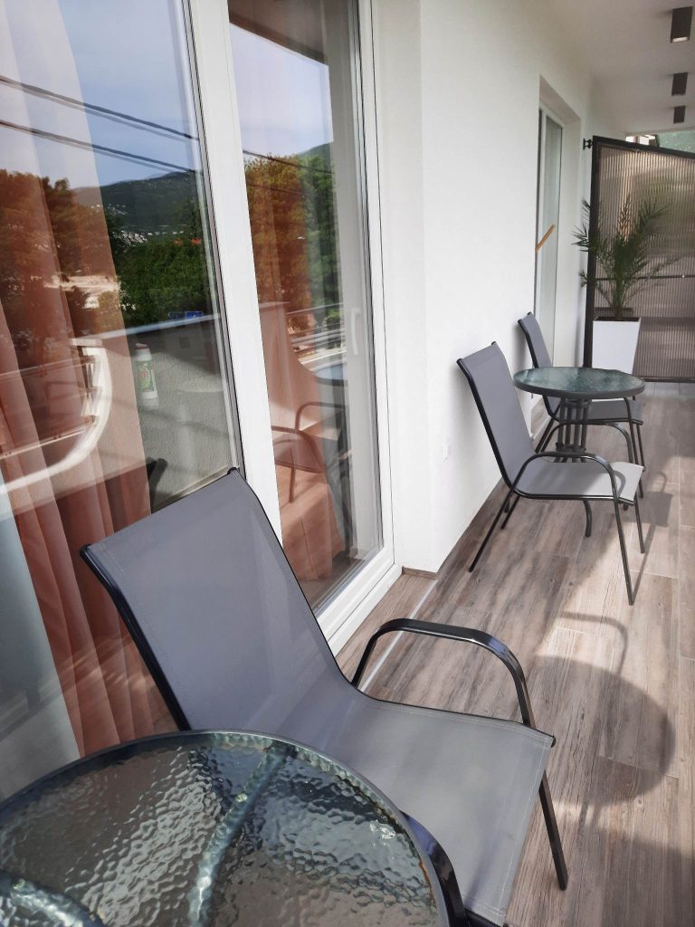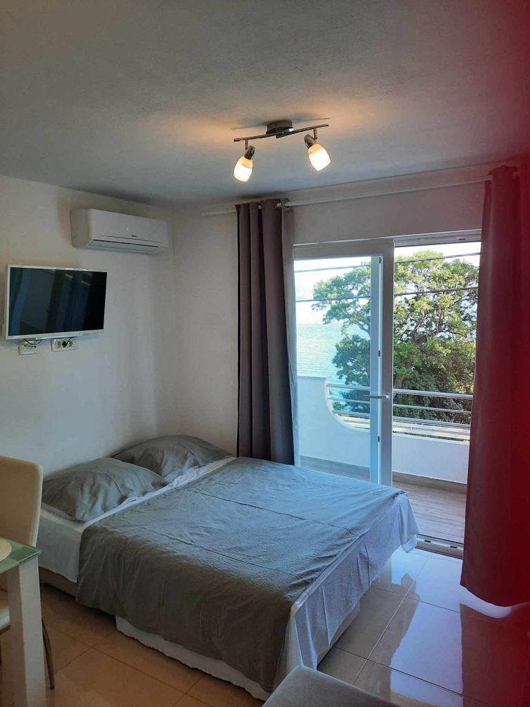 Apartma za 4 osebe. Oprema je enaka kot pri prvem. Sestavljen je iz spalnice z zakonsko posteljo in dnevne sobe, kjer je dvojna postelja plus sivi kavč. Tukaj ima vsaka soba svojo klimatsko napravo. Iz dnevne sobe imate razgled na morje. Na voljo sta balkon in zunanji prostor s teraso. Parkirišče je pred ali za hišo.