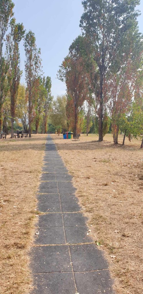 Parkirišče je tik ob parku, zasejeno z vrsto dreves, kjer lahko najdemo prostor za avto v senci.