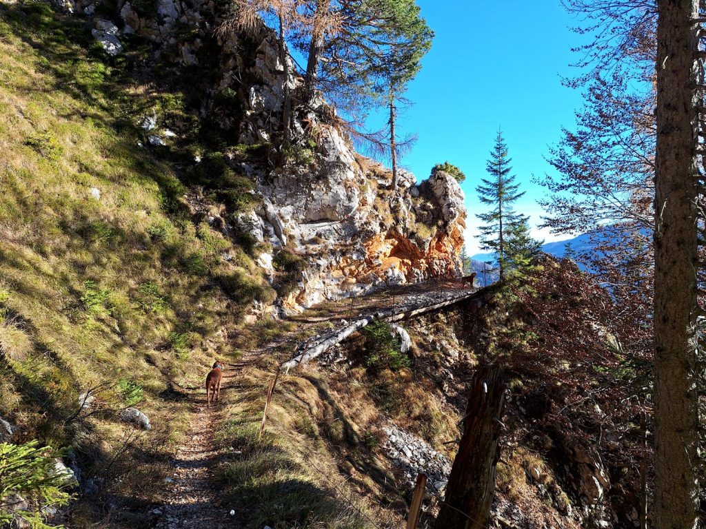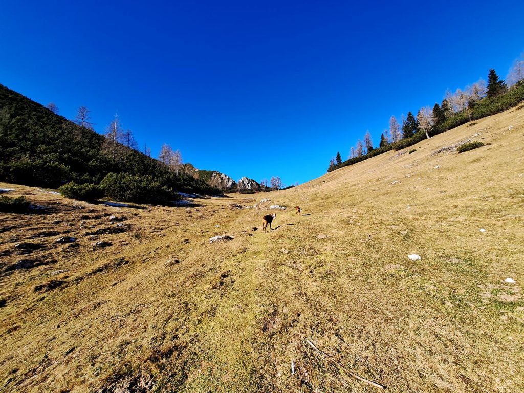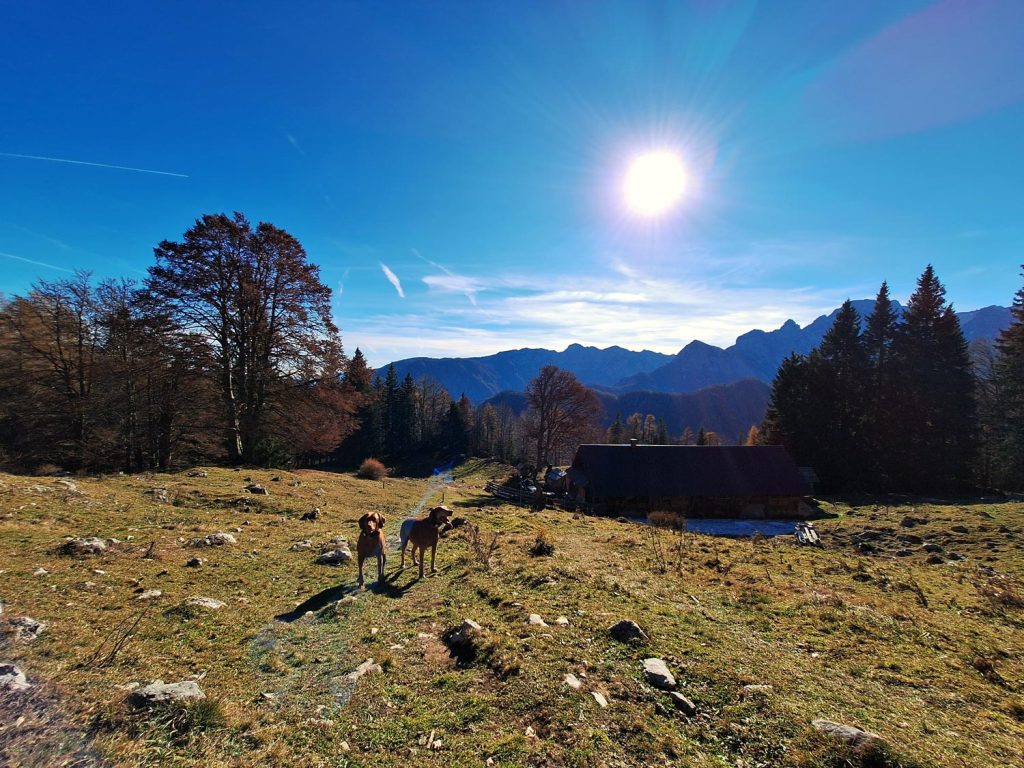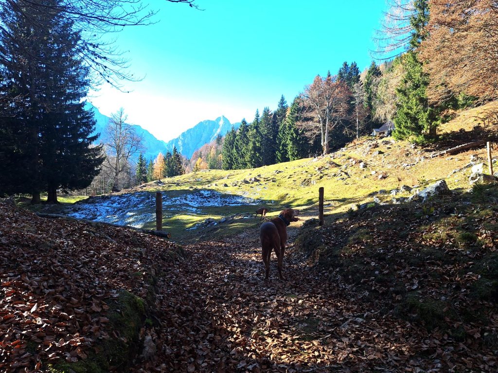 Strmina ne popusti, pot pa preide v bolj plazovita pobočja, tla postanejo kamnita s drobnim peskom (spet nevarno za zdrs!), leva stran poti je razgledna ter zavarovana z žičnato ograjo zaradi živine. Strmina se po 765 metrih višinske razlike le položi in pridemo zopet v gozdnate površine. Nekaj časa še hodimo po travnatih poteh, kar kmalu pridemo do Vrtaške planine (1462m). Pred vstopom v planino je potrebno privezati pse, saj se tukaj nahaja živina. Mi smo bili tukaj pozno jeseni, takrat je planina zaprta in živine ni.