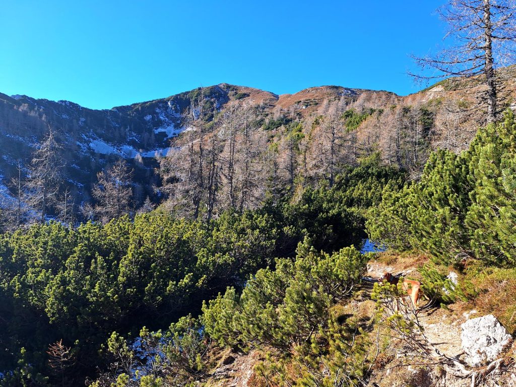 Pri planini imamo ponovno smerokaz, ki nas usmeri v malce manj zahtevno strmino, pot je sprva široka nato pa je potrebno prečiti malenkost ožje travnate poti, preko katerih pridemo na razgledeno travnato pobočje. Preko pobočja se zopet strmo vzpenjamo skozi manjše ruševje. Ostane nam samo še greben Slemena, tu že vidimo naš cilj.