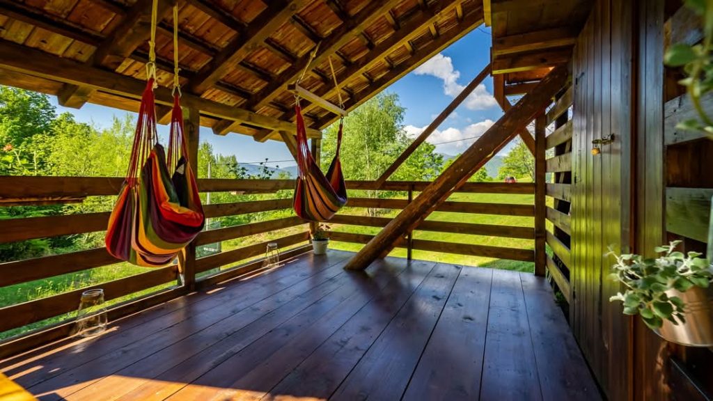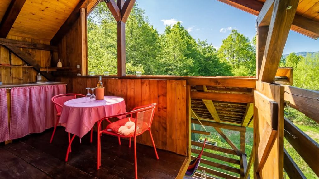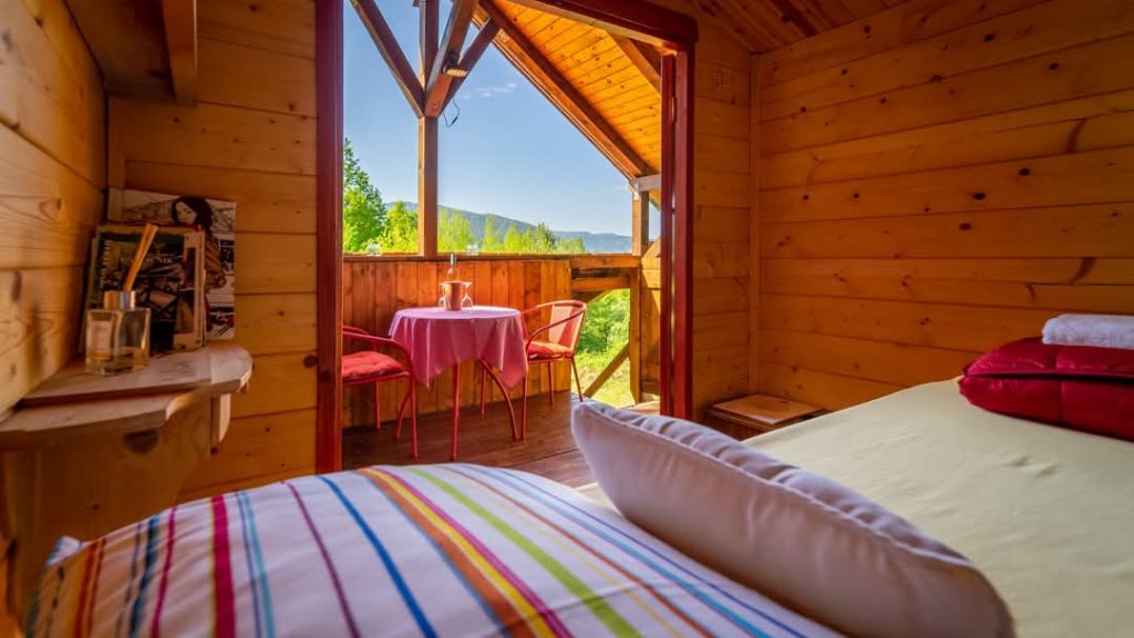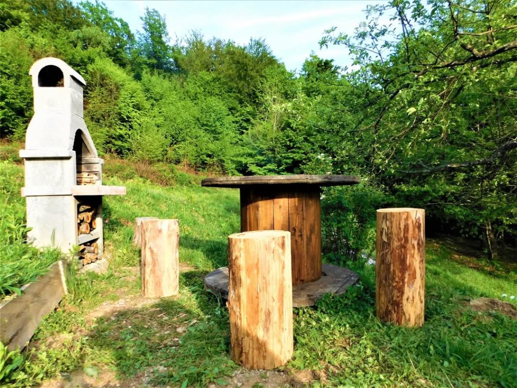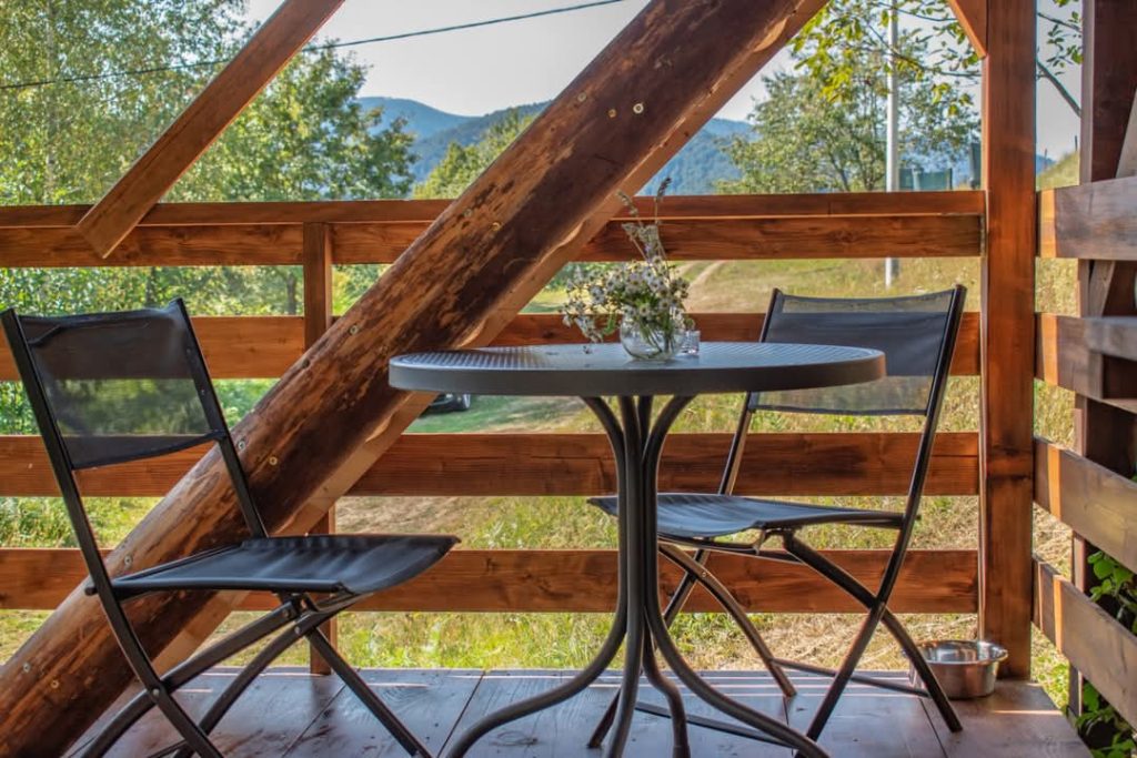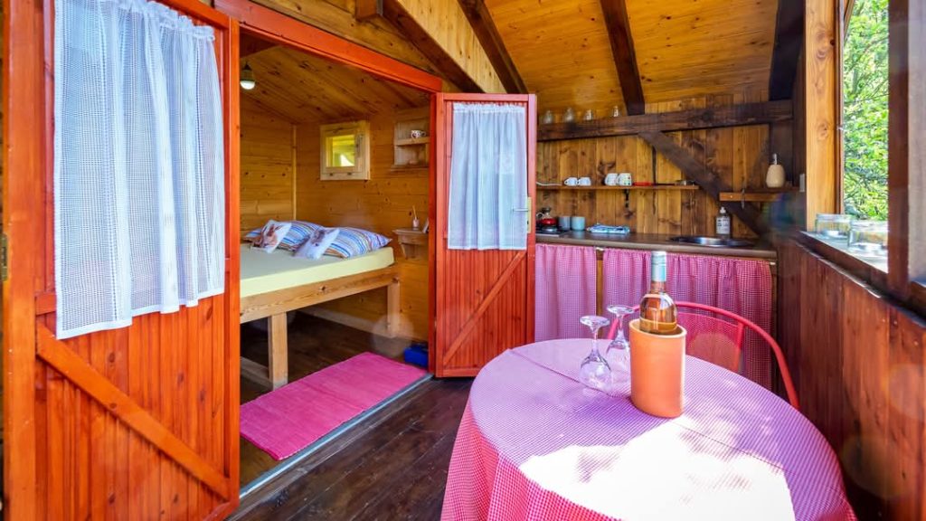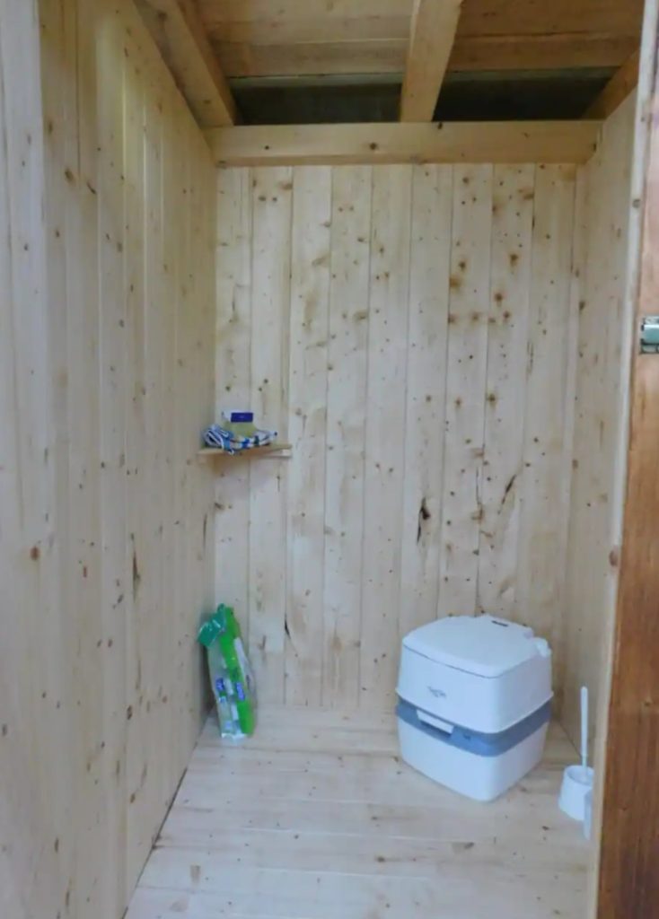 Hiška je opremljena z majhno kuhinjo, zunanja kopalnica oziroma tuš ter WC (prenosni kemični) pa sta dostopna s spodnje terase. Terasa ponuja čudovit pogled na naravo. Na voljo imate tudi pitno vodo v kanistrih, ki si jih lahko napolnite ob bližnjem izviru, ter zunanji žar.