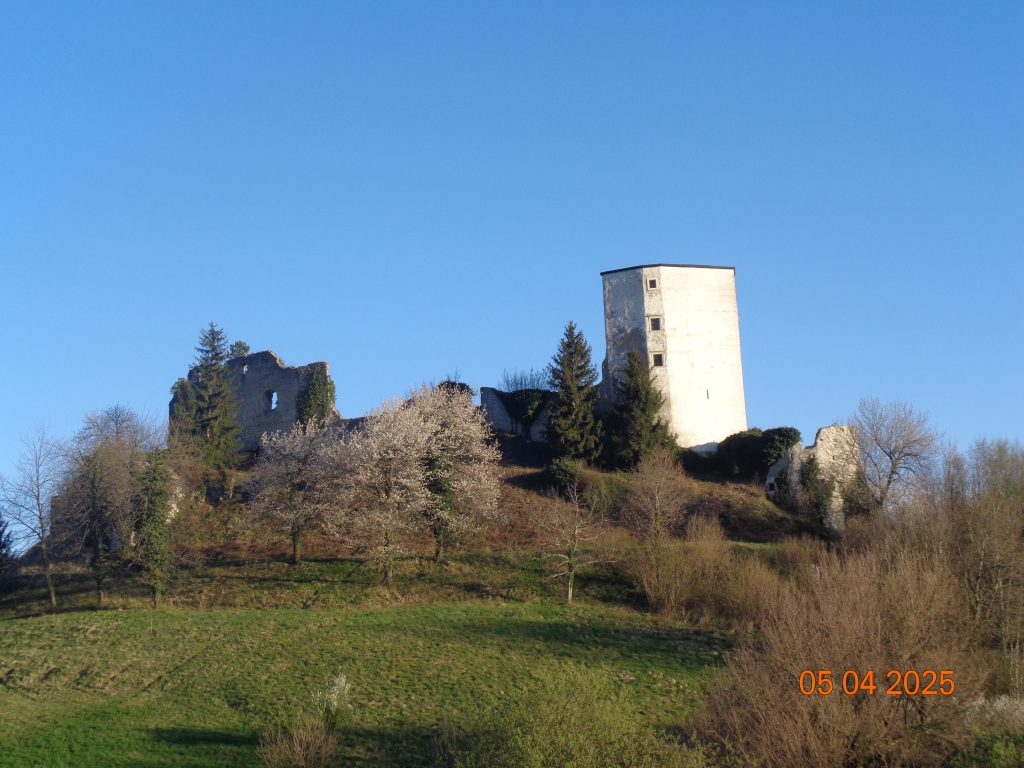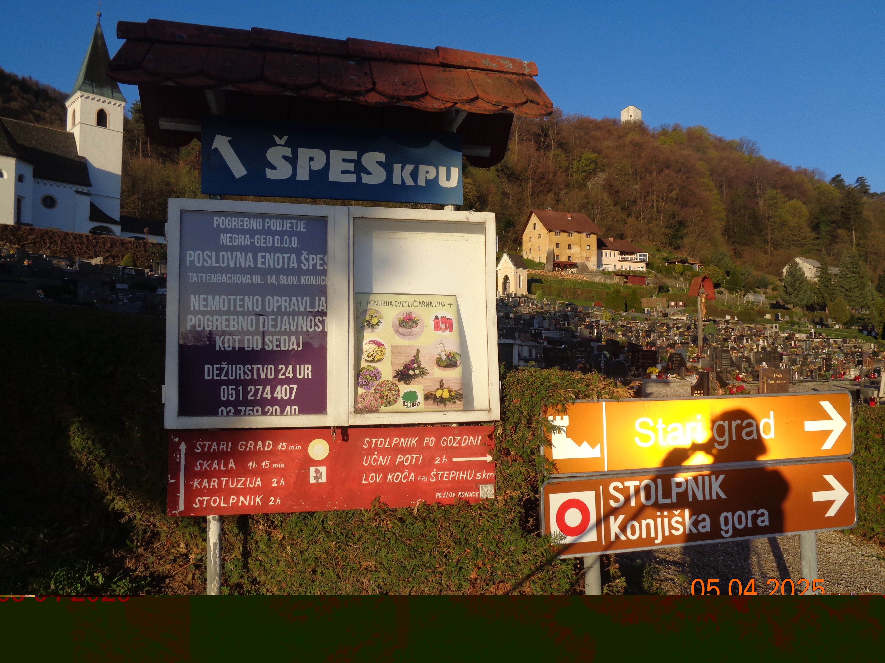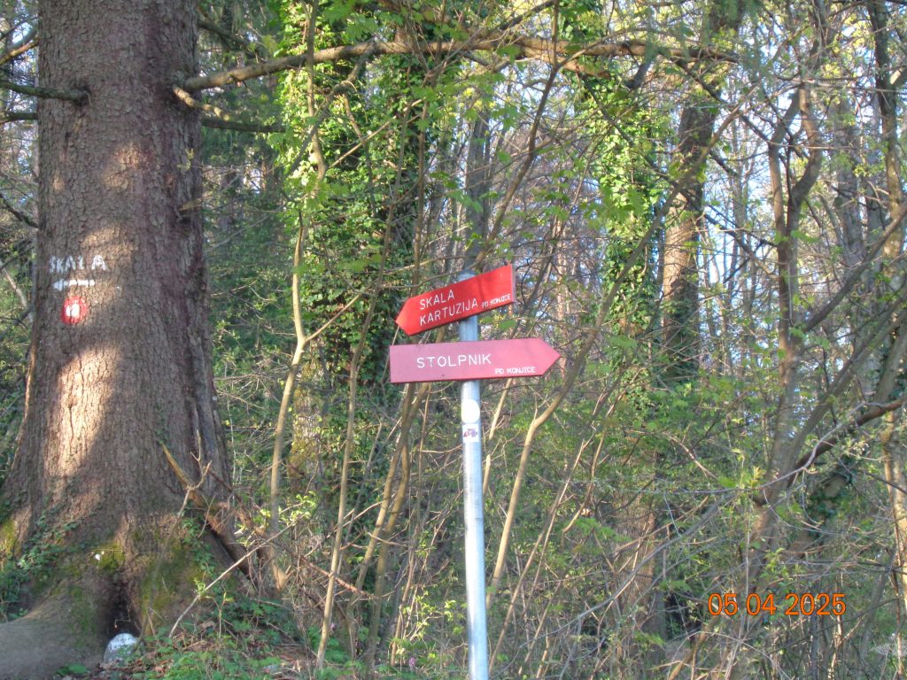 Pot nas je pripelje iz gozda na makadamsko cesto, katero smo le prečile (Skala, Kartuzija, čeprav je tabla za Stolpnik desno). Desno po cesti je grad Konjice – cca 5 minut.