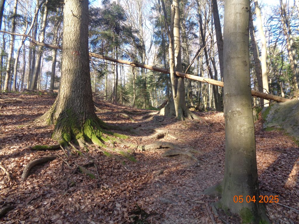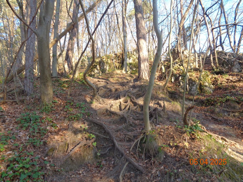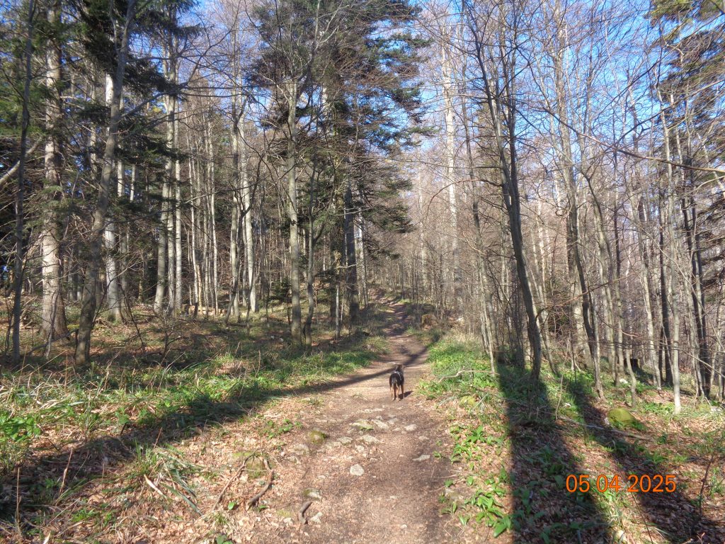 Široka, zmerno strma pot, nas je naprej peljala skozi gozd, kjer smo prečile manjšo delno že zaraščeno jaso.