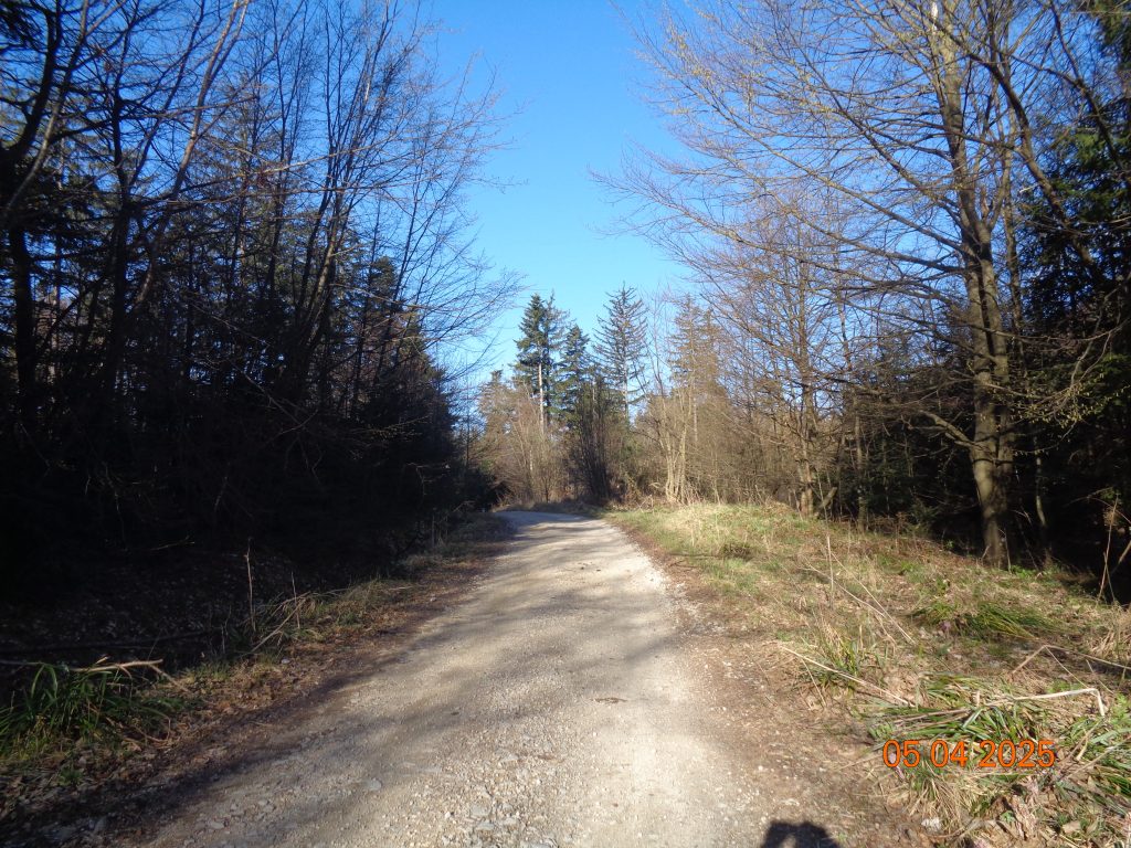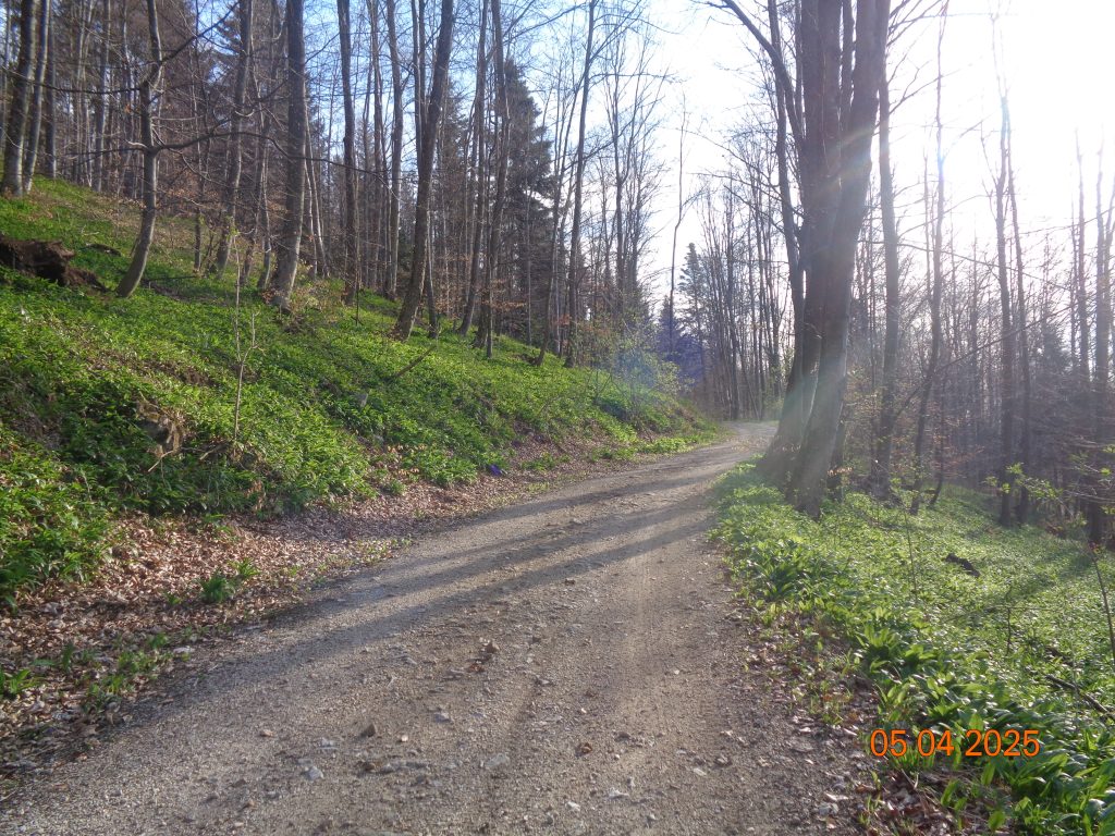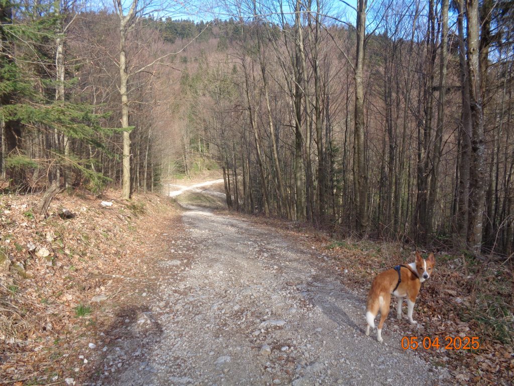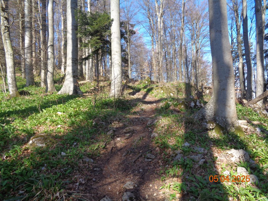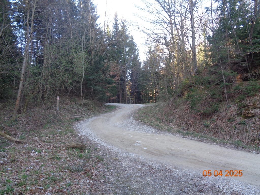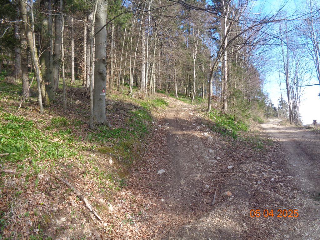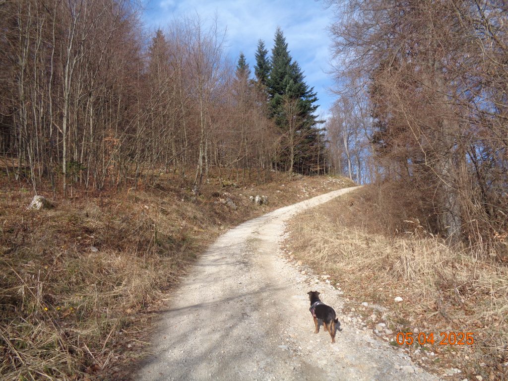 Ko cesta naredi levi ovinek, smo le to zapustile in vzpon nadaljevale po zmerno strmi peš poti (kolovozu), ki se ponovno vzpne skozi gozd.