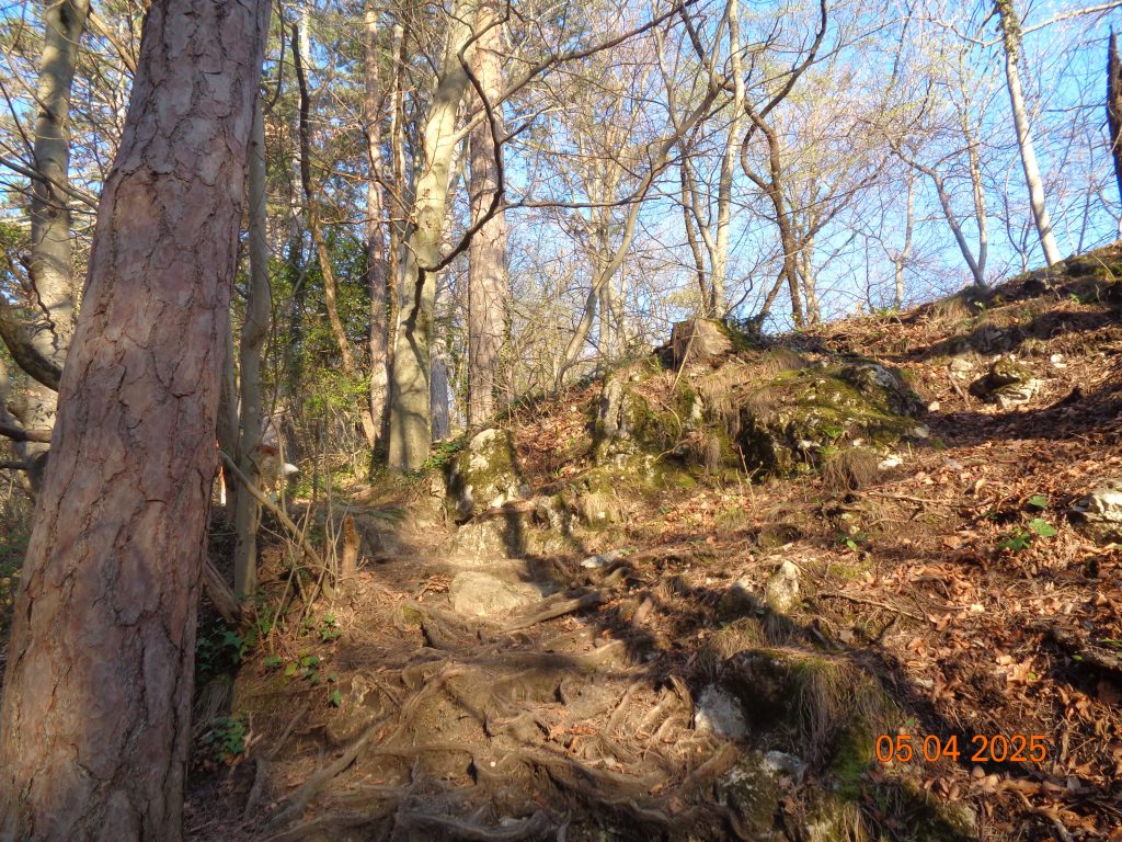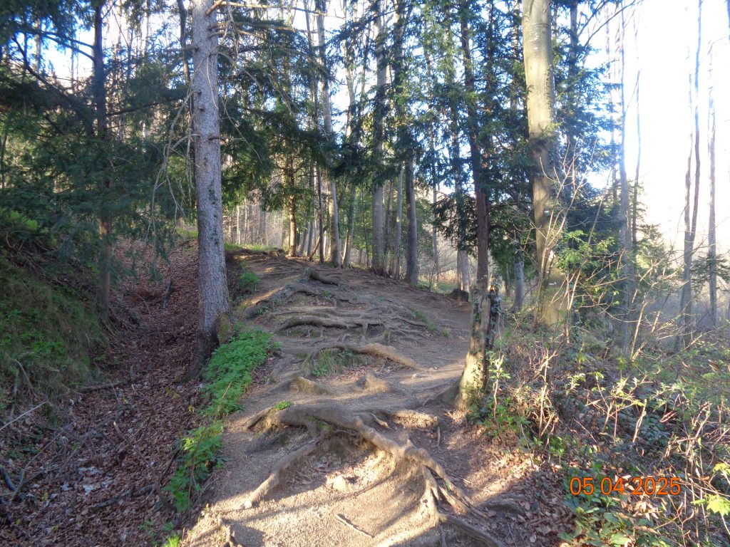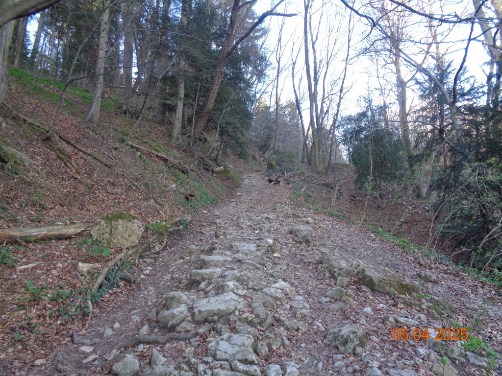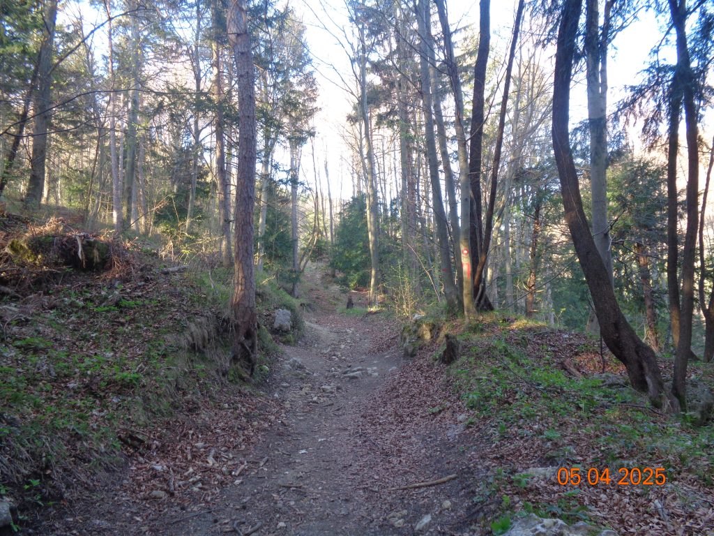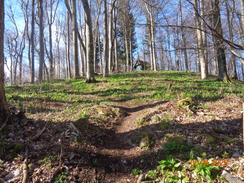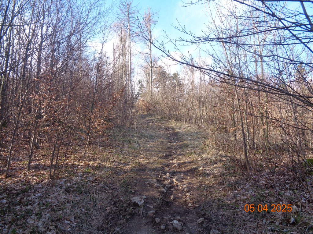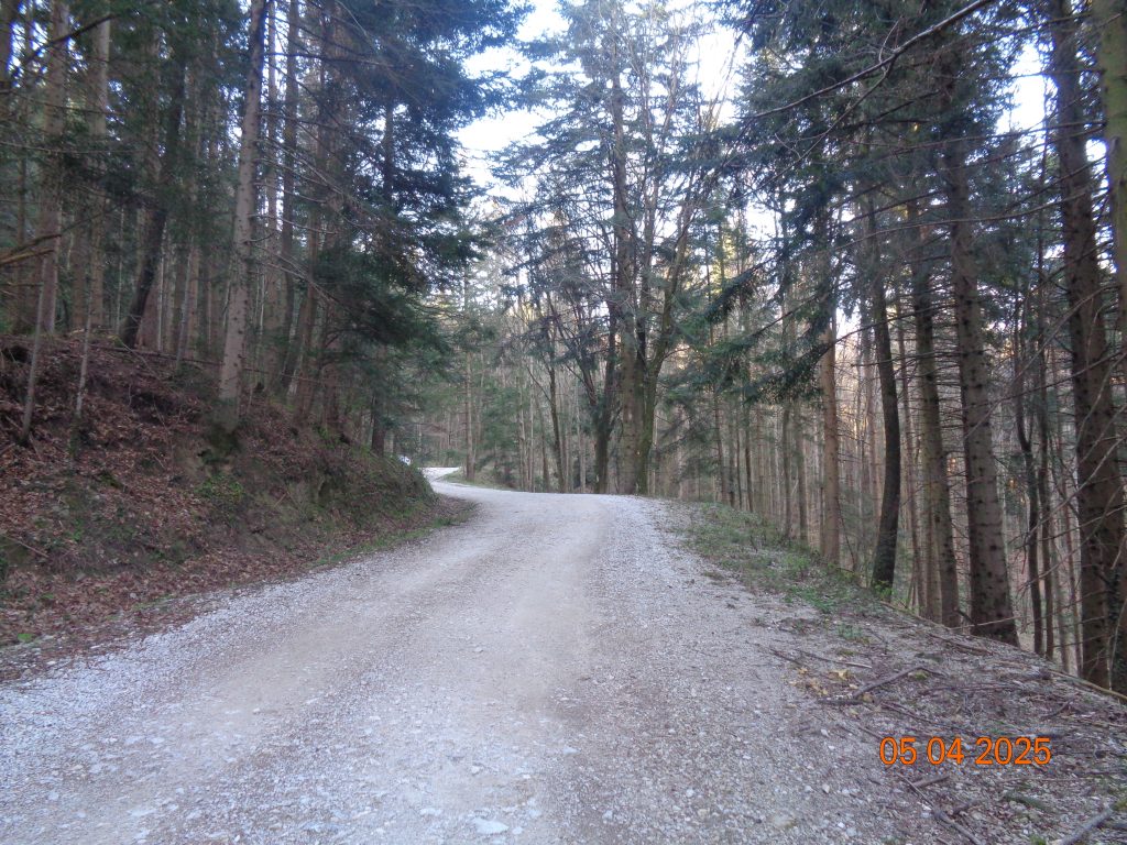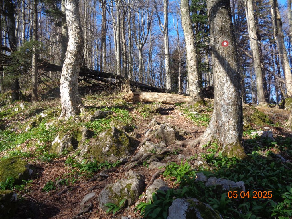 Ko cesta naredi levi ovinek, smo le to zapustile in vzpon nadaljevale po zmerno strmi peš poti (kolovozu), ki se ponovno vzpne skozi gozd.