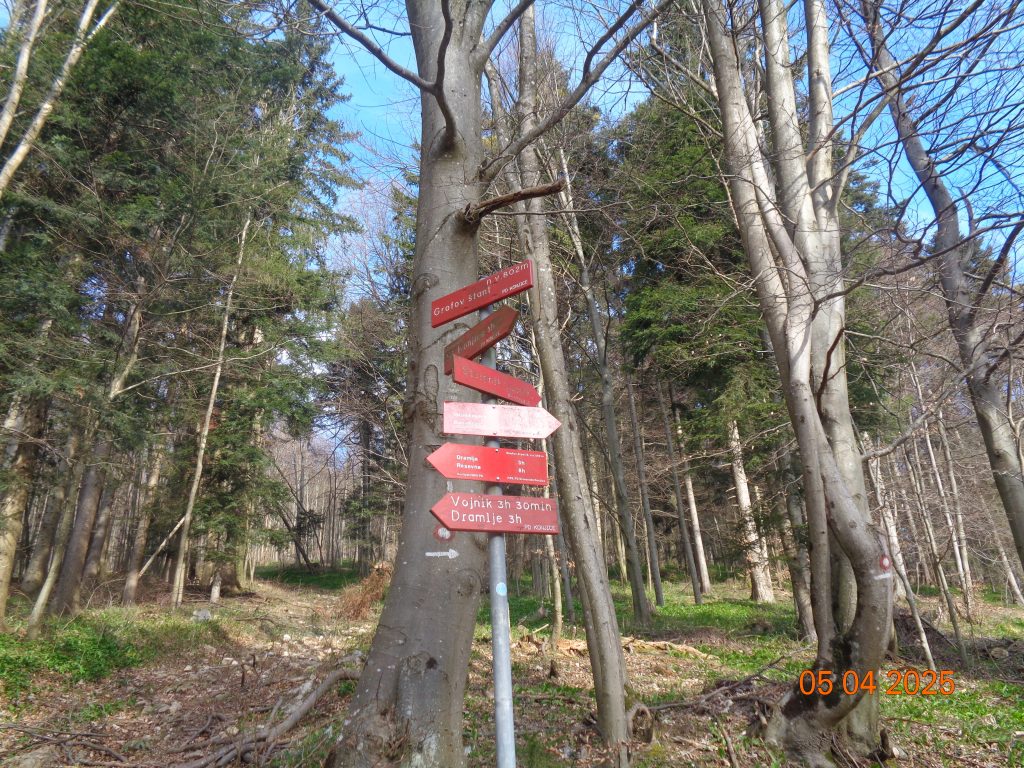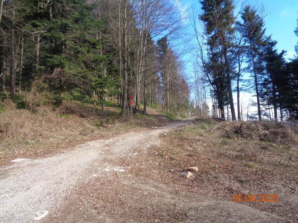 Širok kolovoz po katerem smo hodile, nas je v nekaj korakih pripeljal do razpotja poti, kjer nas je markacija usmerila levo navzgor.