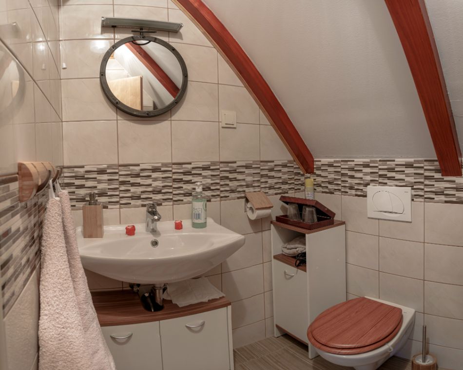 V pritličju hiše se nahajajo kopalnica, kuhinja in dnevni prostor z veliko jedilno mizo. V mansardi so tri spalnice in dodatna kopalnica. Spalnice so opremljene z zakonsko posteljo, dvema posameznima posteljama in otroško posteljico. Vse sobe imajo televizijo, brezžični internet in posteljnino. Gostom je na voljo brezplačno parkirišče na dvorišču, brezplačen WiFi v celotnem objektu, sobe za nekadilce in možnost bivanja hišnih ljubljenčkov brez dodatnega plačila. Kuhinja je popolnoma opremljena s kuhinjsko mizo, štedilnikom, pečico, kuhinjskim priborom, grelnikom vode, mikrovalovno pečico, hladilnikom, napo, aparatom za kavo in toasterjem. Hodnik ima garderobo in copate.