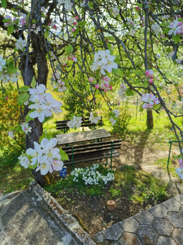 🐾 na klopci pod cvetočo jablano za jutranjo kavico,