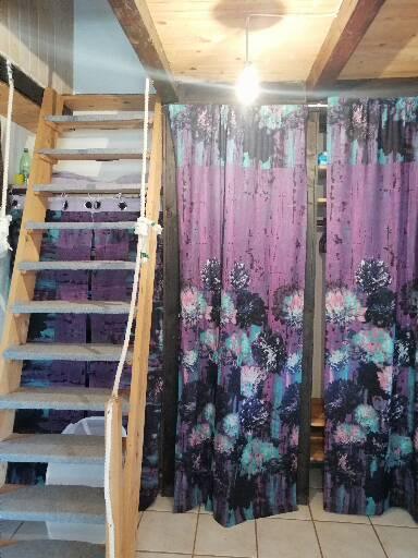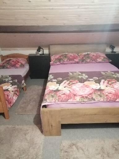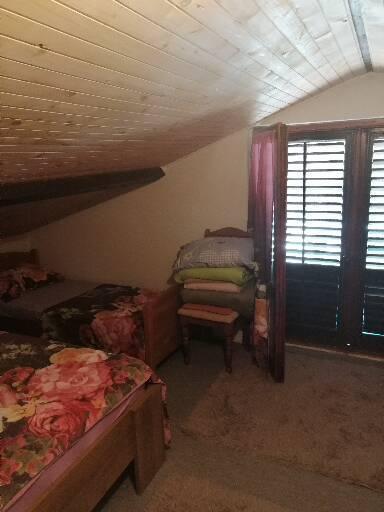 Pritličje: terasa, manjša dnevna soba, kuhinja in kopalnica. V nadstropju je mansarda – enoten prostor z eno posteljo za 2 osebi in štirimi enojnimi posteljami.