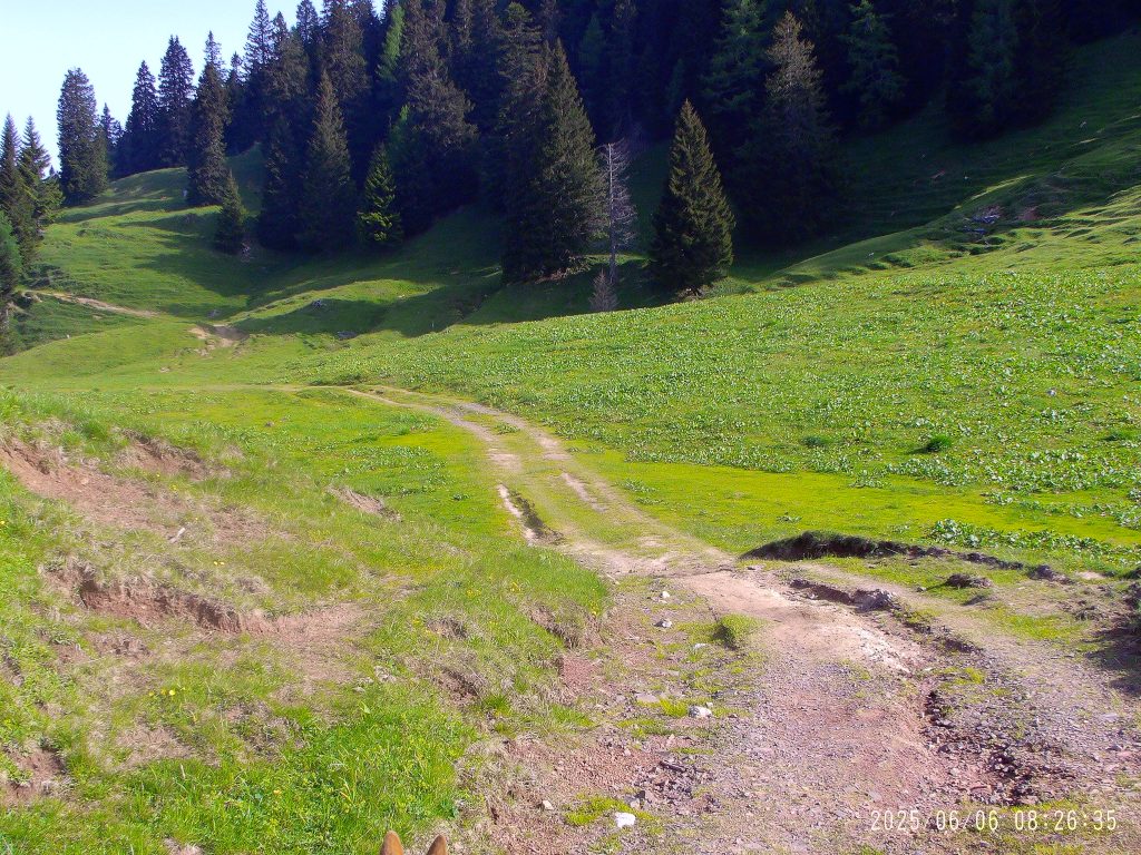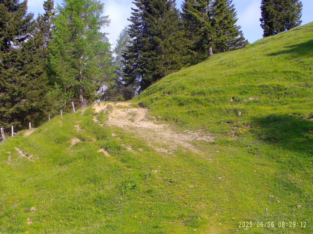 Tu smo stopile na strma s travo porasla pobočja na slovenski strani, kjer je v mokrem nevarnost zdrsa.