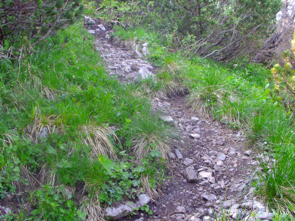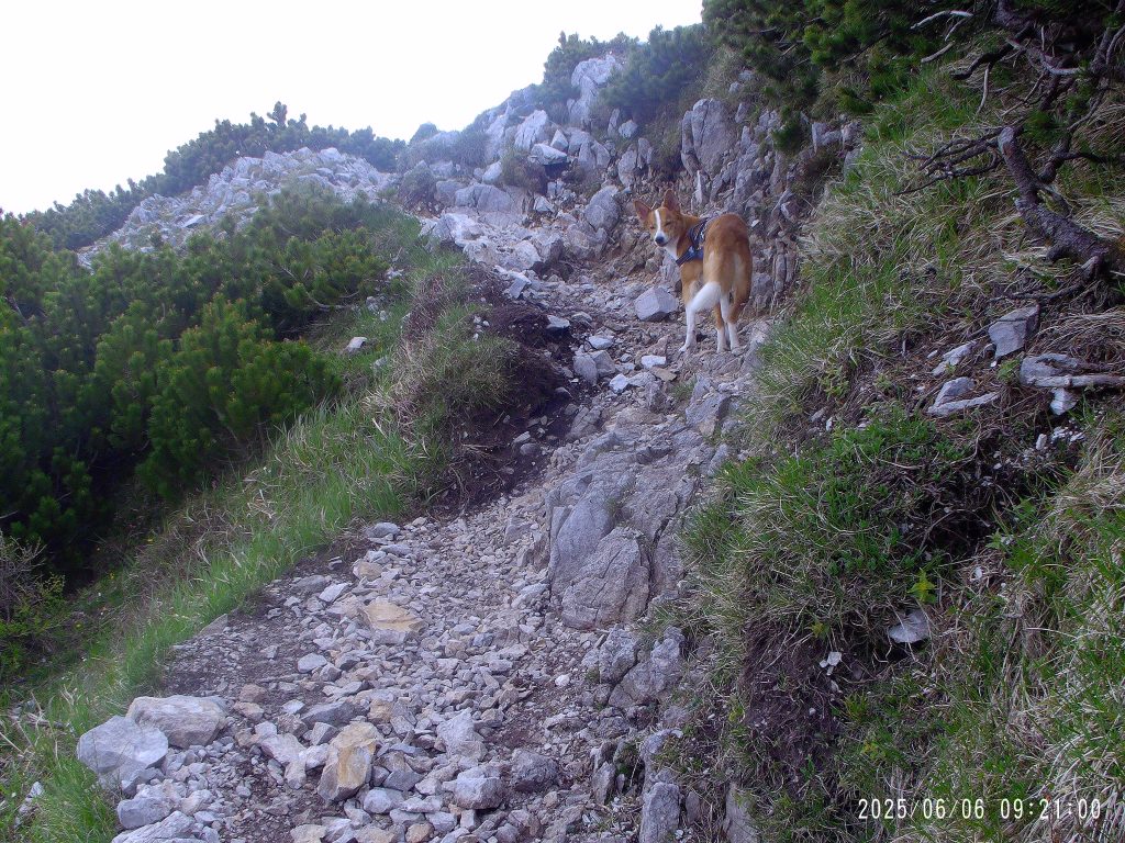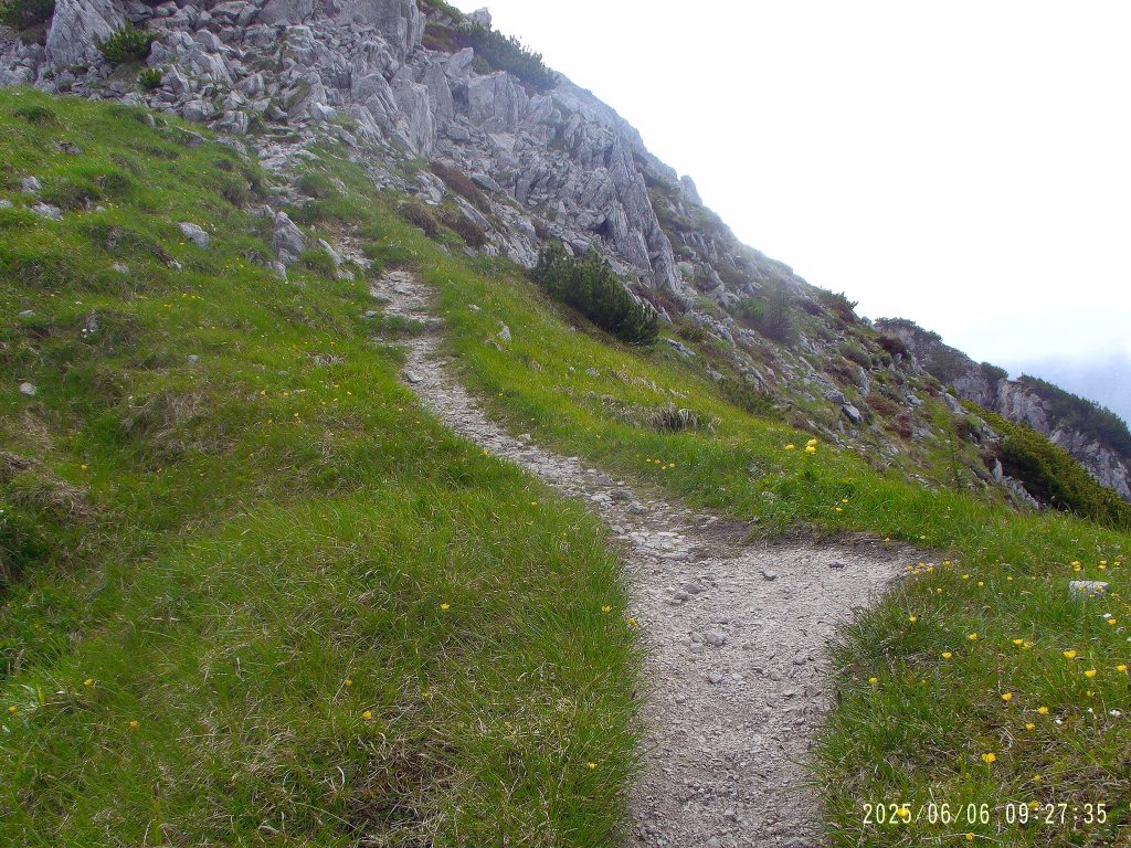 Razmeroma zložna pot nas je kmalu pripeljala na mejni greben, kjer se nam z leve priključi pot od koče na Ljubelju.