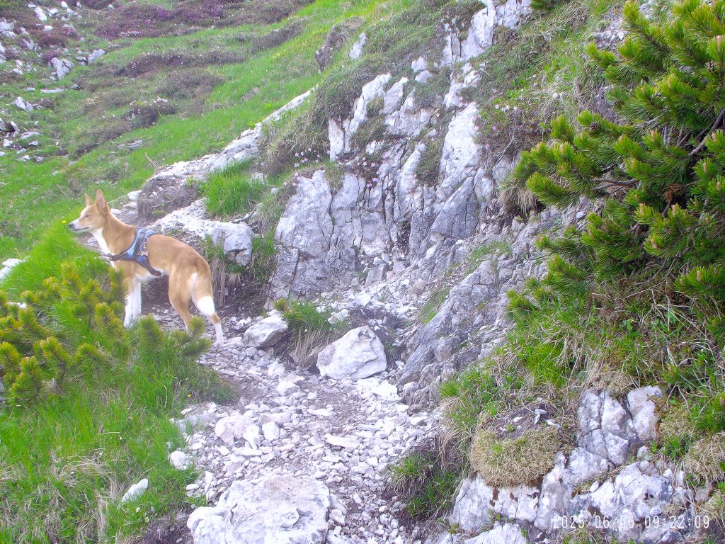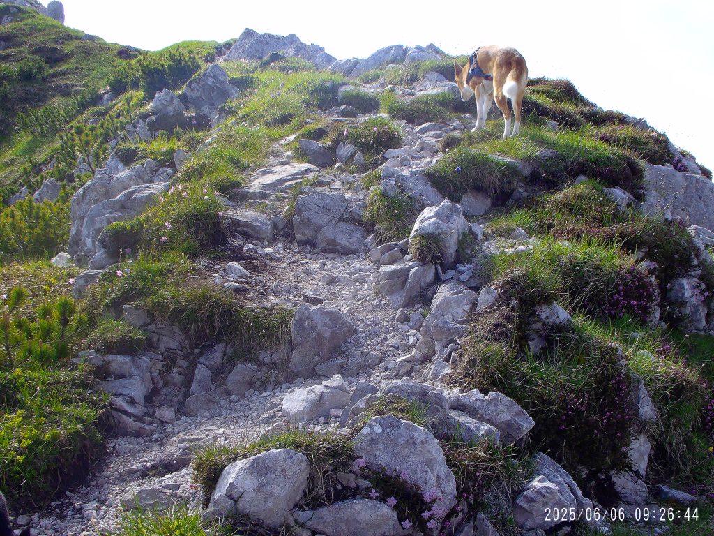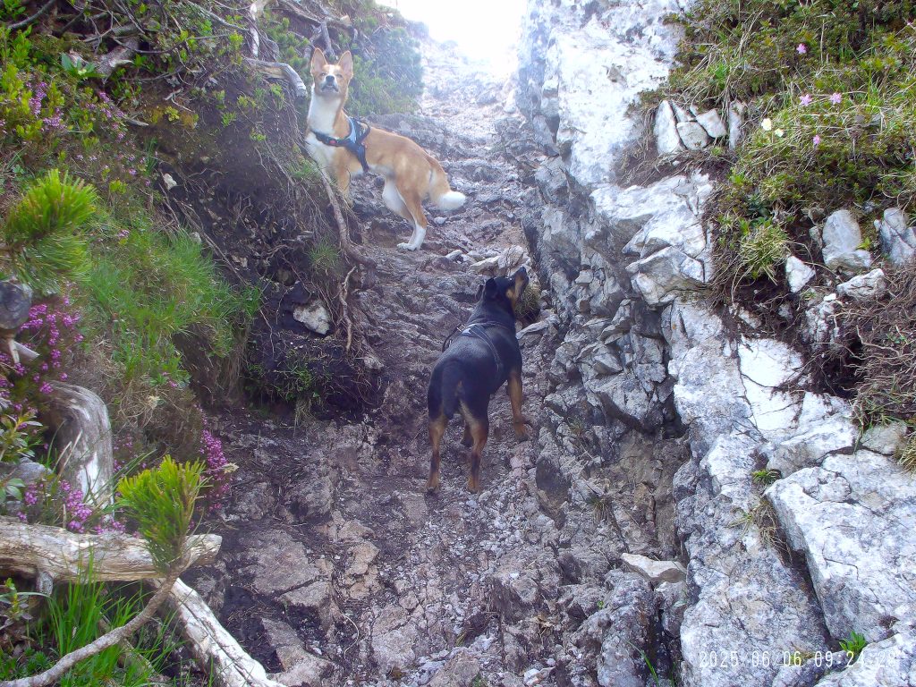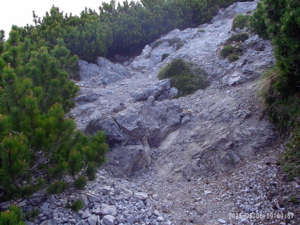 Pot, ki se je vzpenjala skozi rušje, nas je pripeljala na avstrijsko stran. Tu smo se vzpnele skozi kratko, a kar precej strmo grapo nazaj na greben.