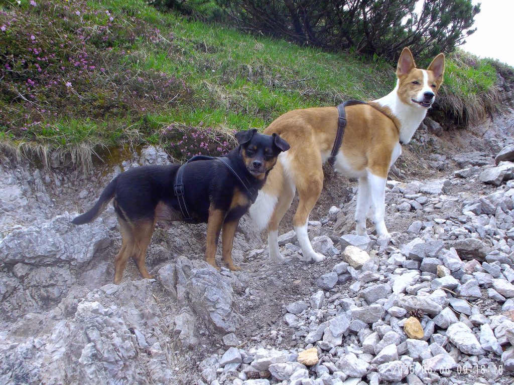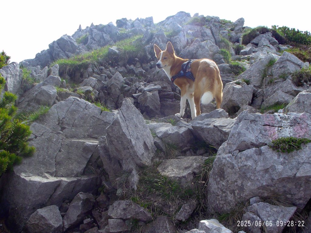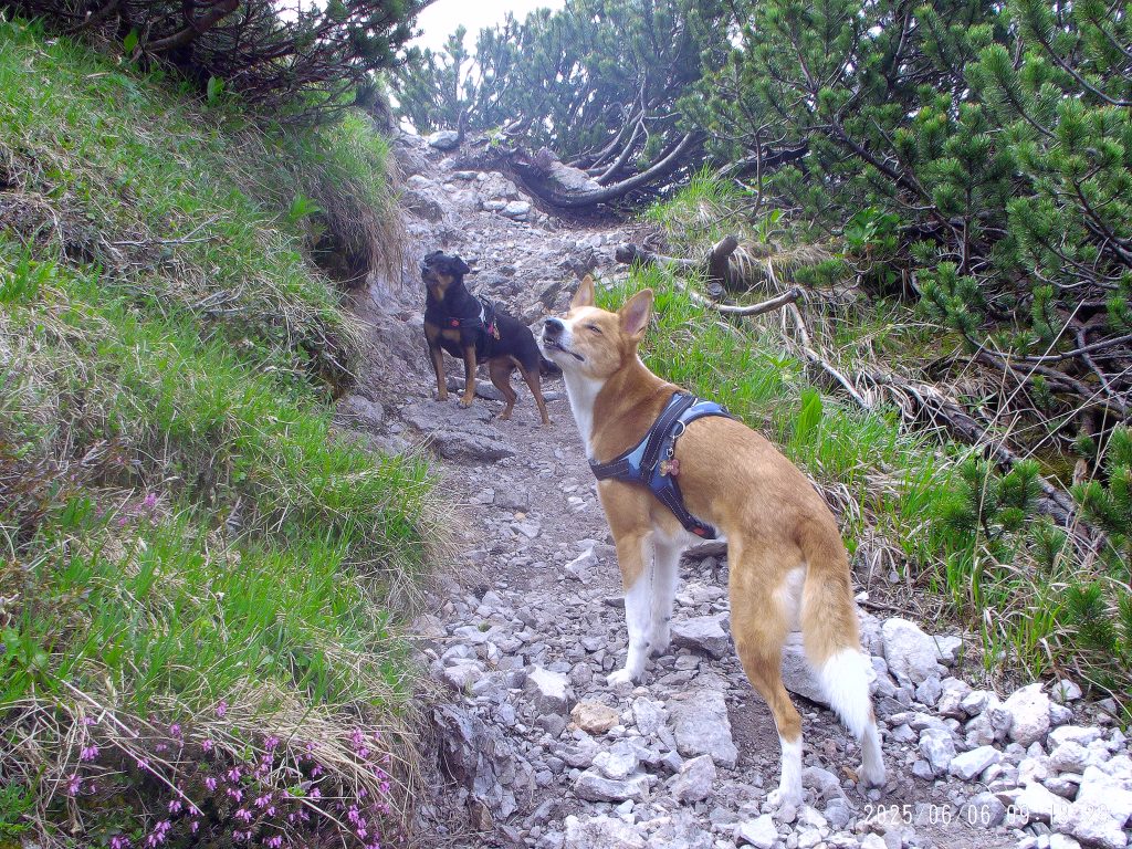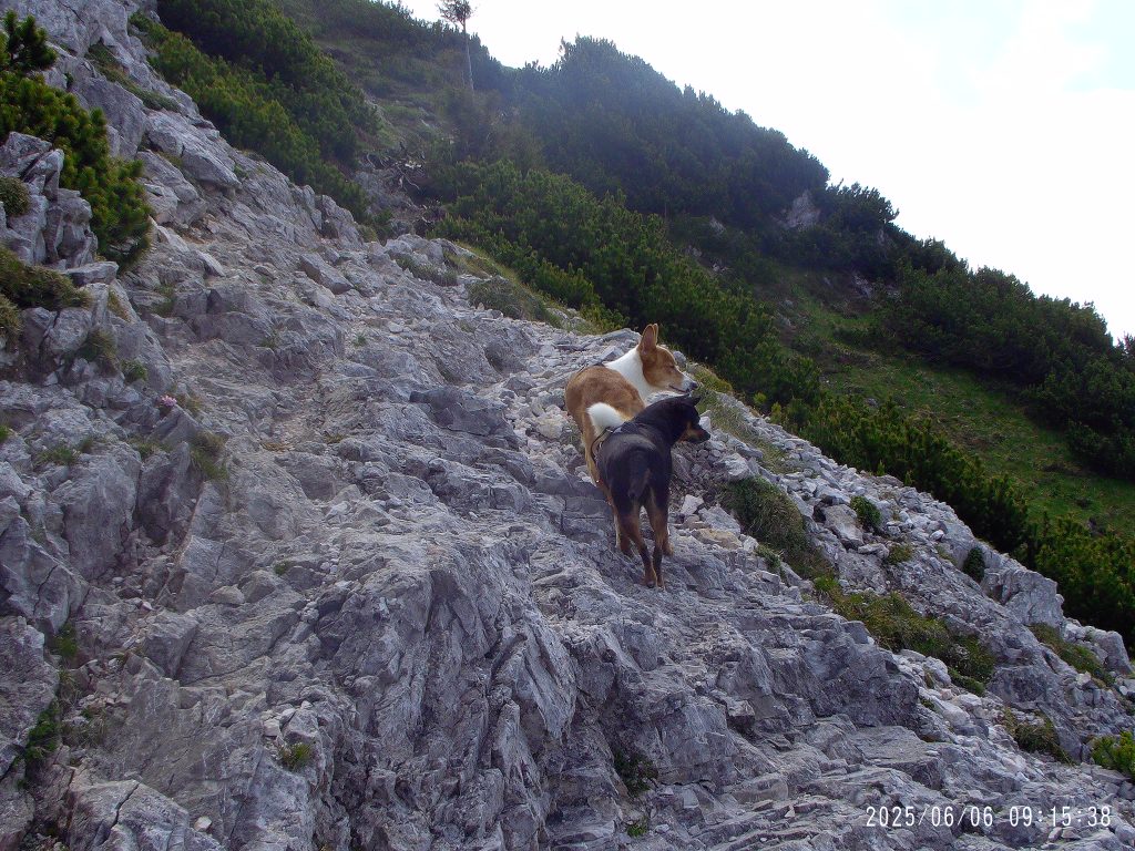 Pot, ki se je vzpenjala skozi rušje, nas je pripeljala na avstrijsko stran. Tu smo se vzpnele skozi kratko, a kar precej strmo grapo nazaj na greben.