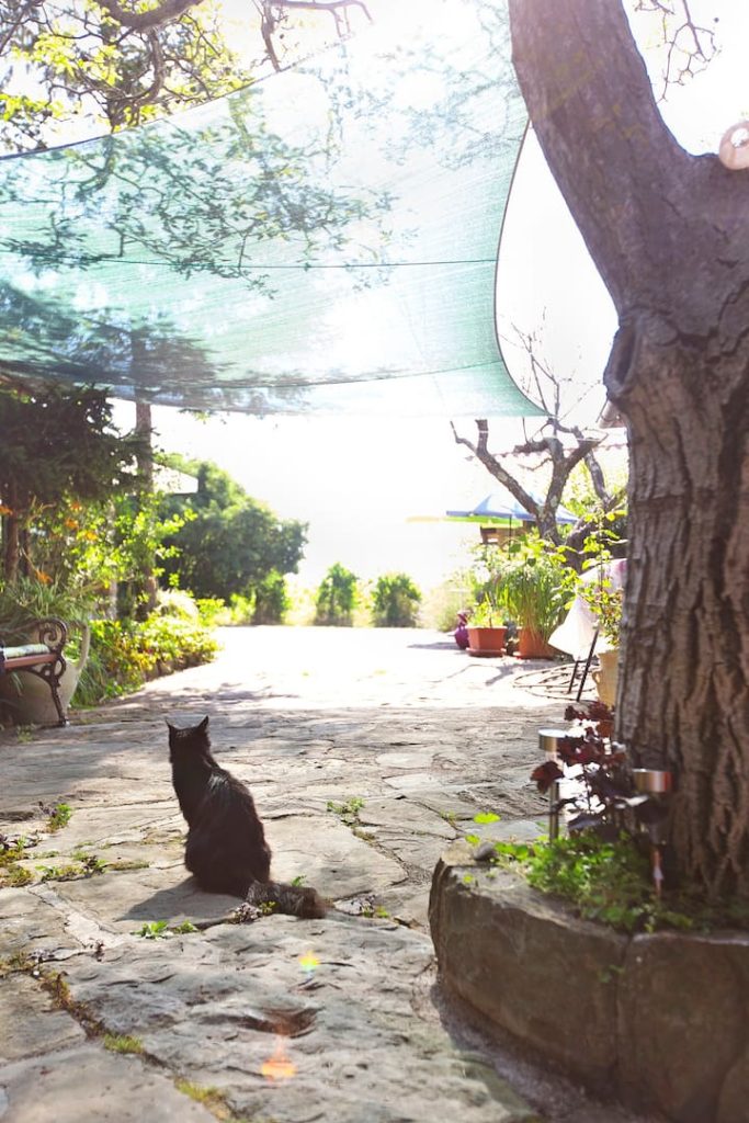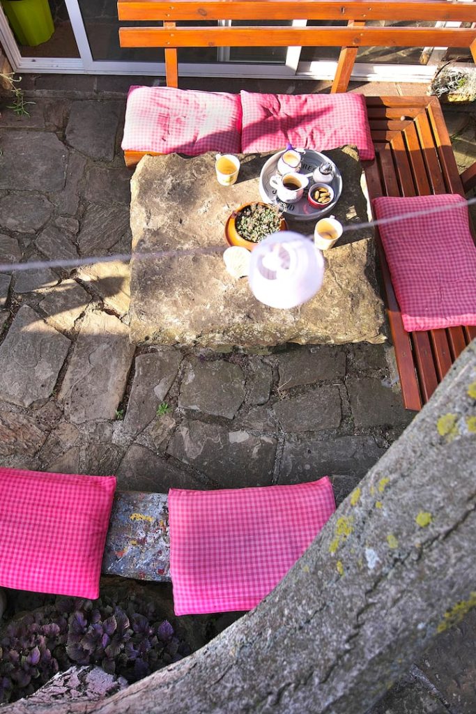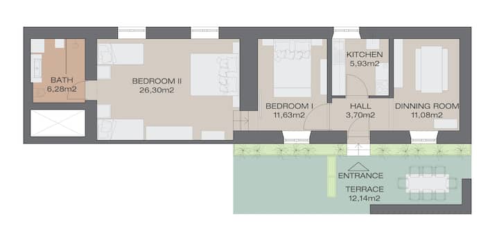 Velika zasebna terasa, obdana z zelenjem, grmi in drevesi, zagotavlja prijetno senco in popolno sprostitev na prostem. Za ljubitelje peke na žaru je na voljo delujoč zunanji kamin, kjer se lahko ob dobri hrani in pijači družite z drugimi gosti.