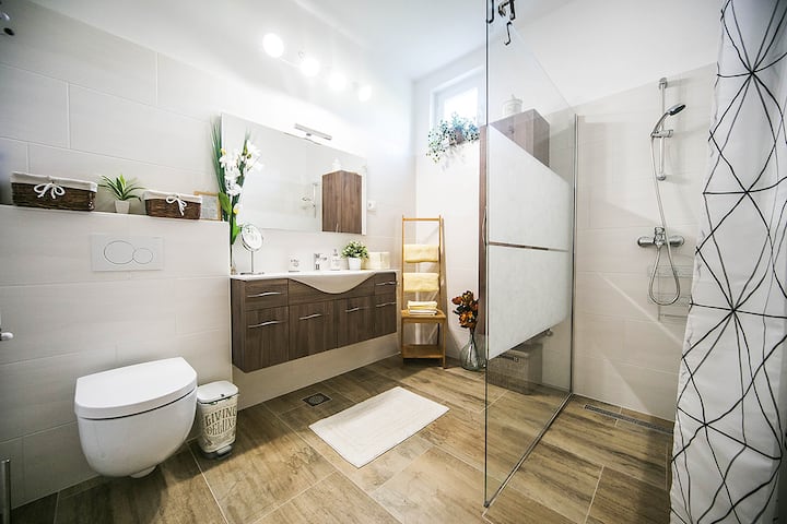 Kopalnica je lepo urejena in opremljena z vsemi osnovnimi elementi. Gostom so na voljo sveže brisače in posteljnina.
