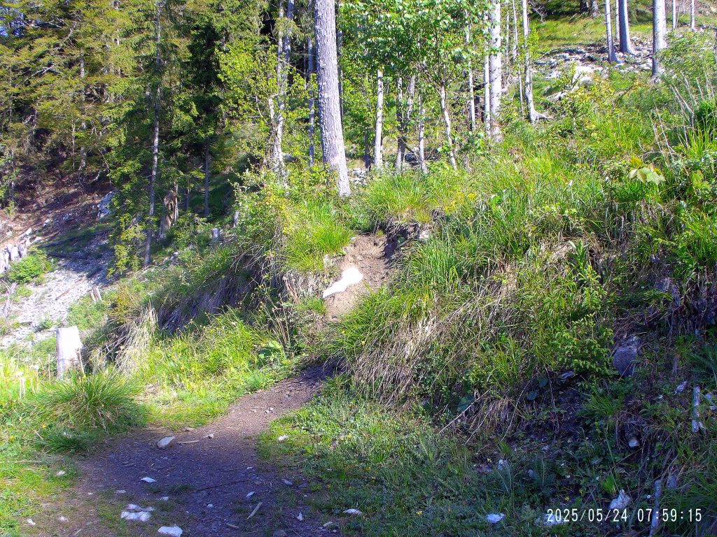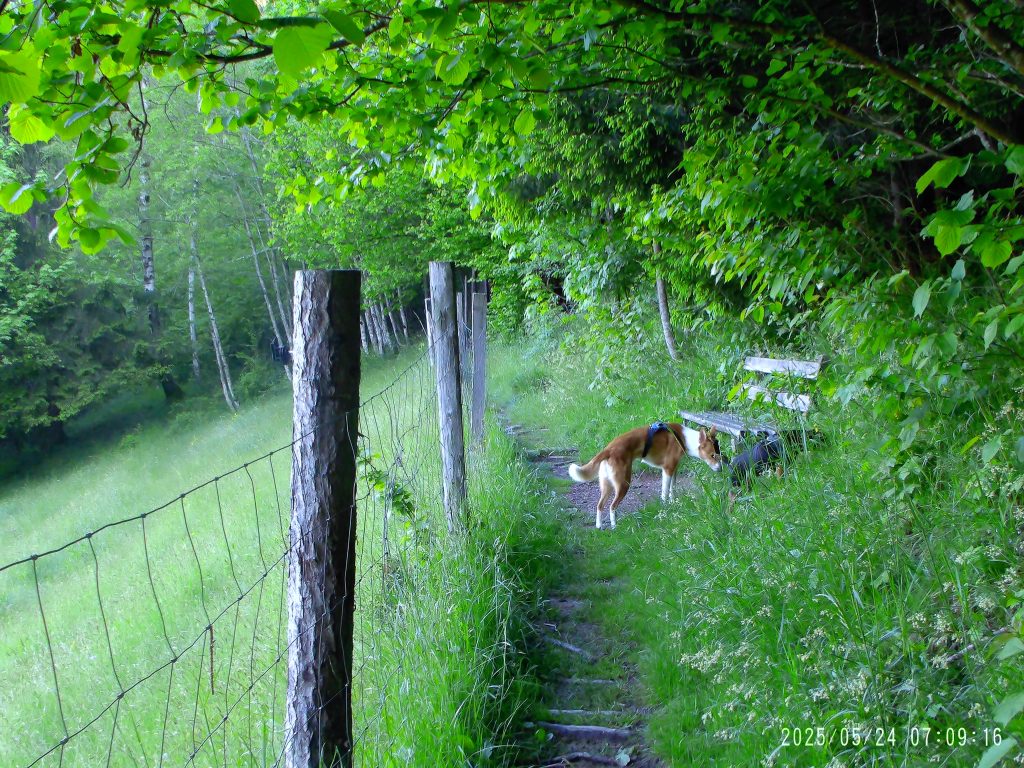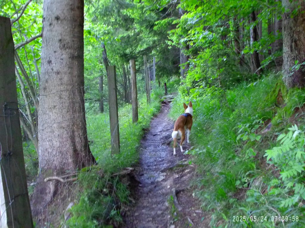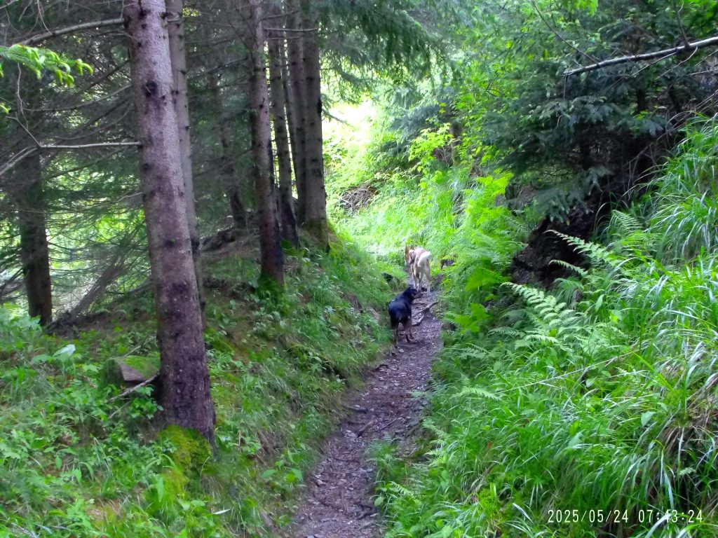 Za tem gre pot v gozd, kjer se zmerno vzpenja. Pot preči tudi potoček.