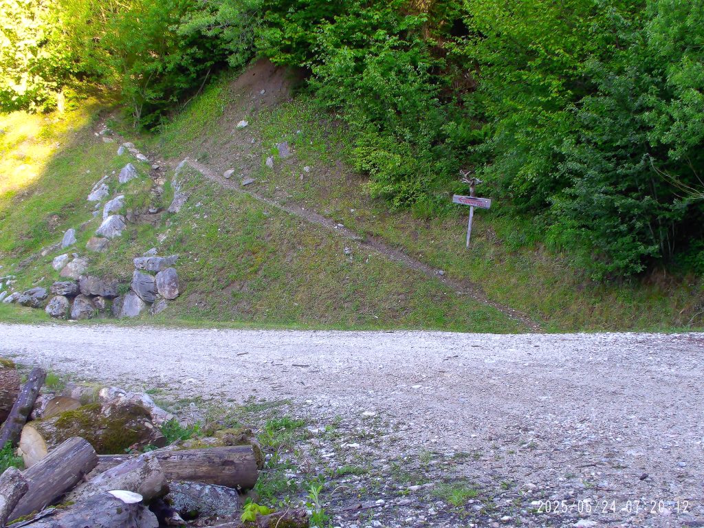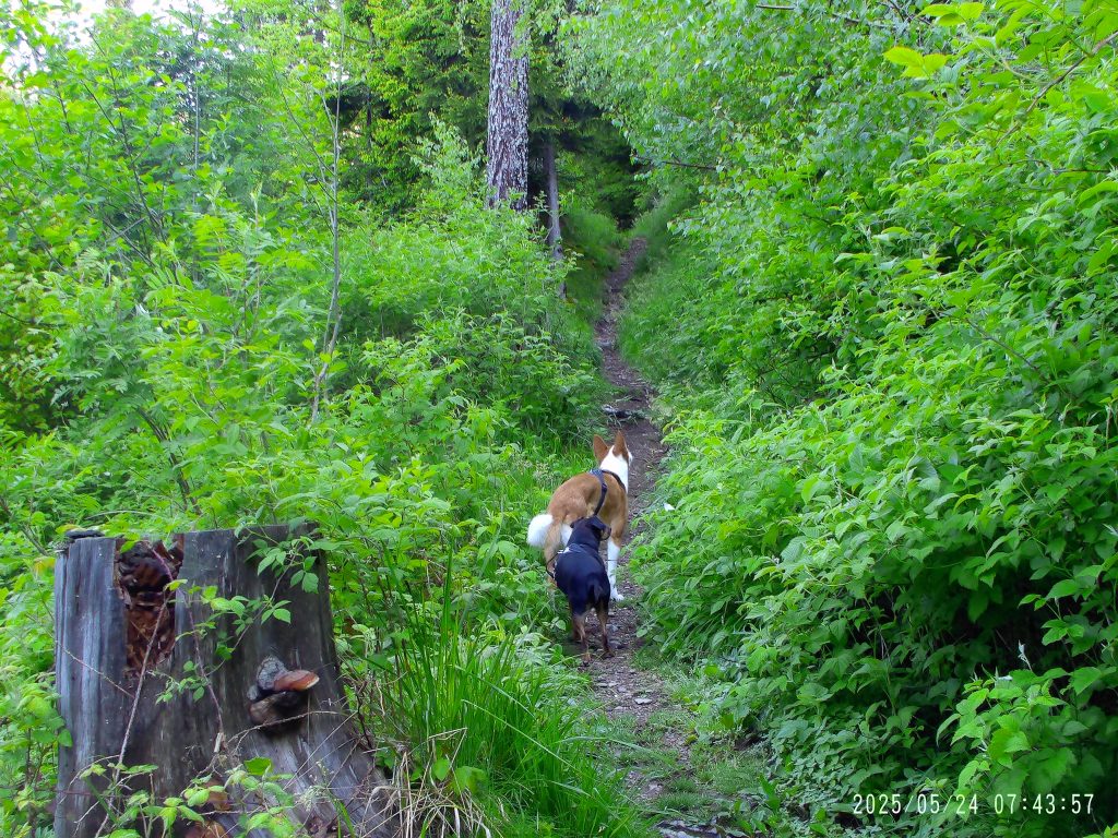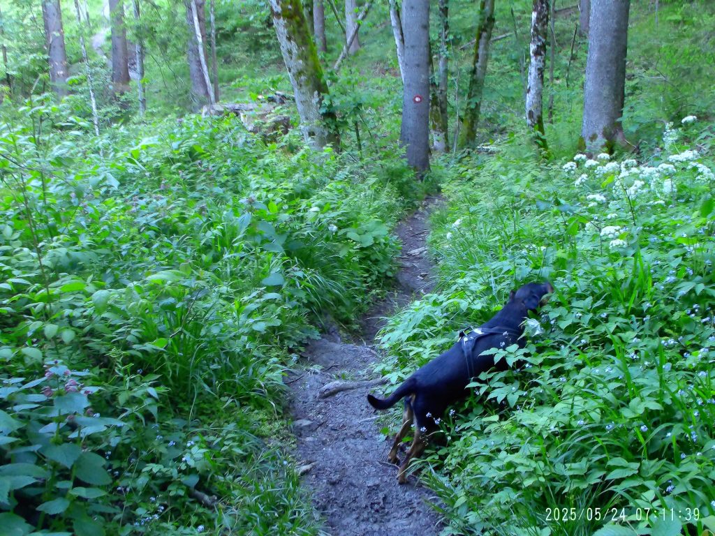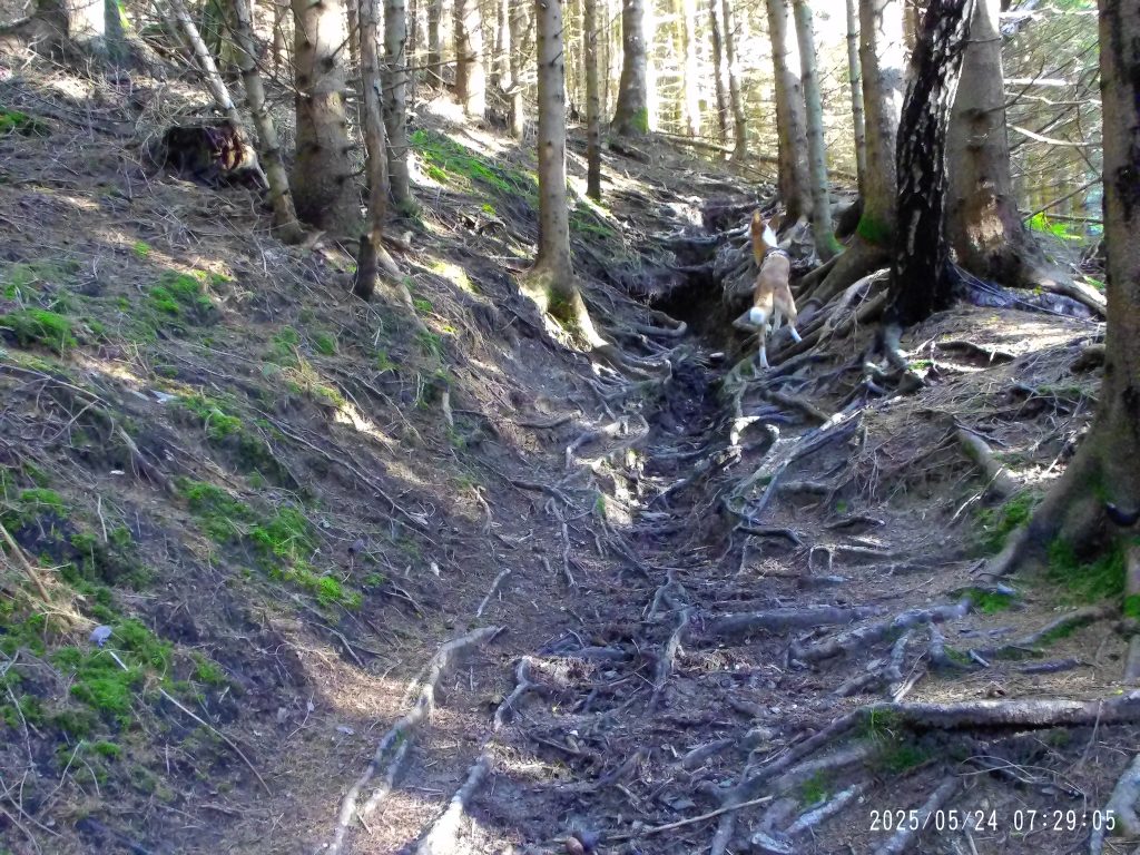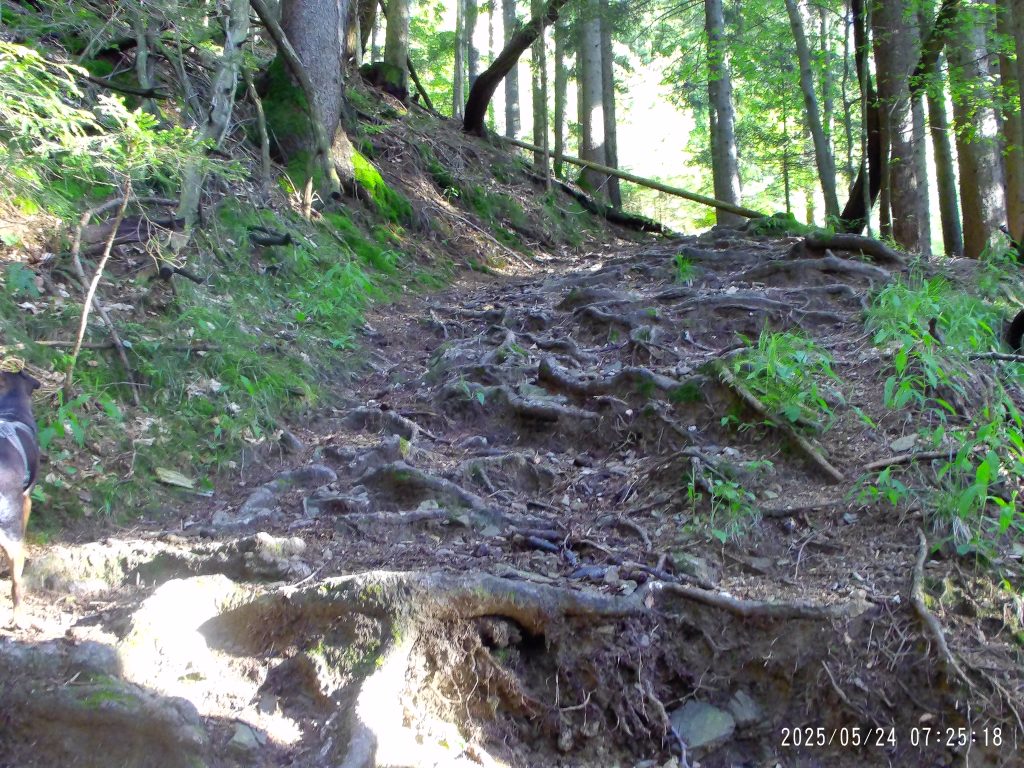 Markirana peš pot cesto preči, zato pa se začne strmo vzpenjati skozi strnjen gozd.