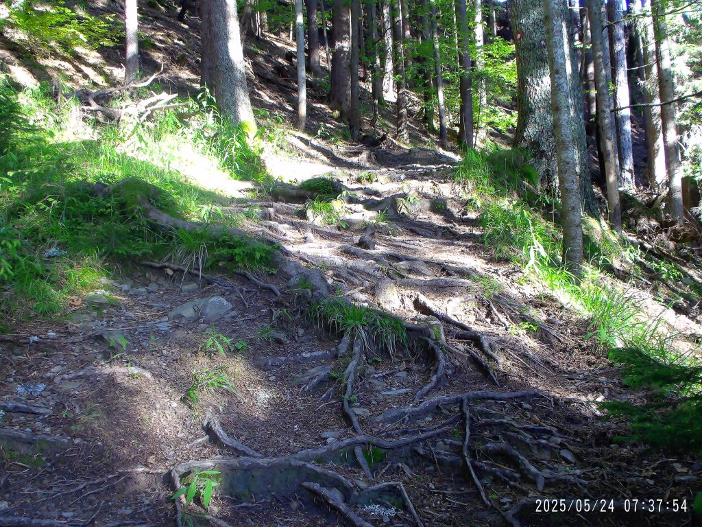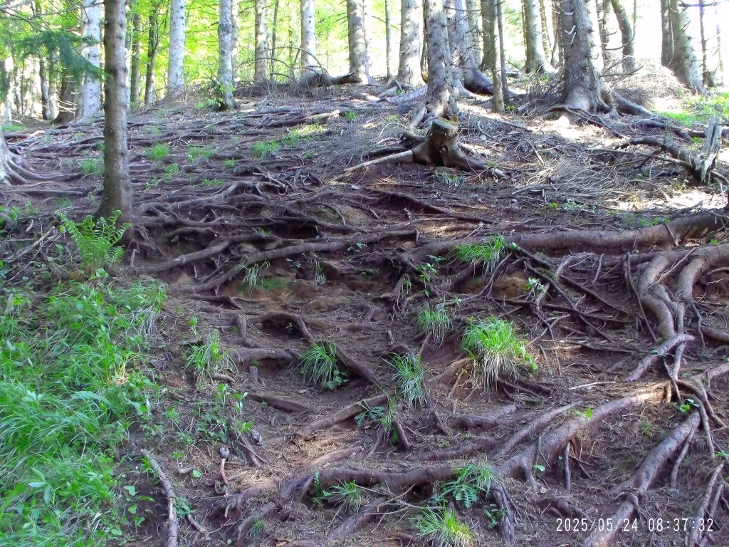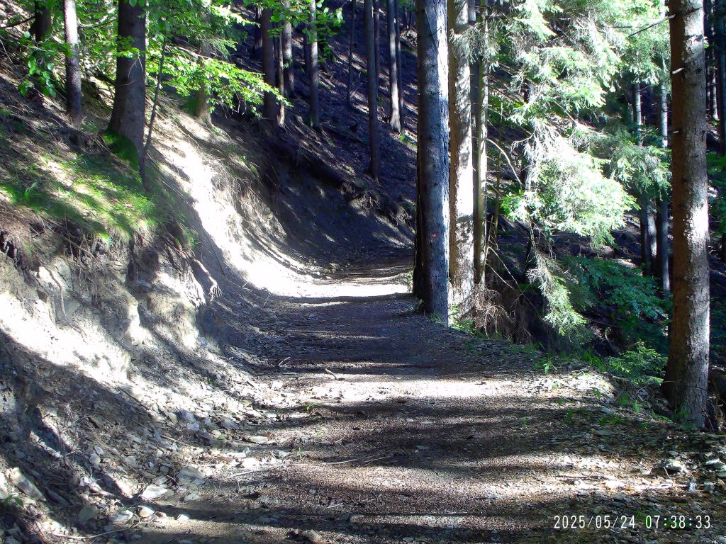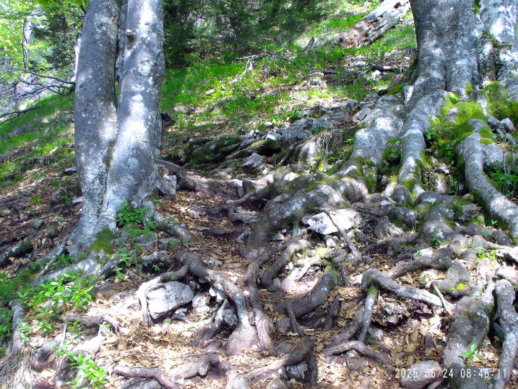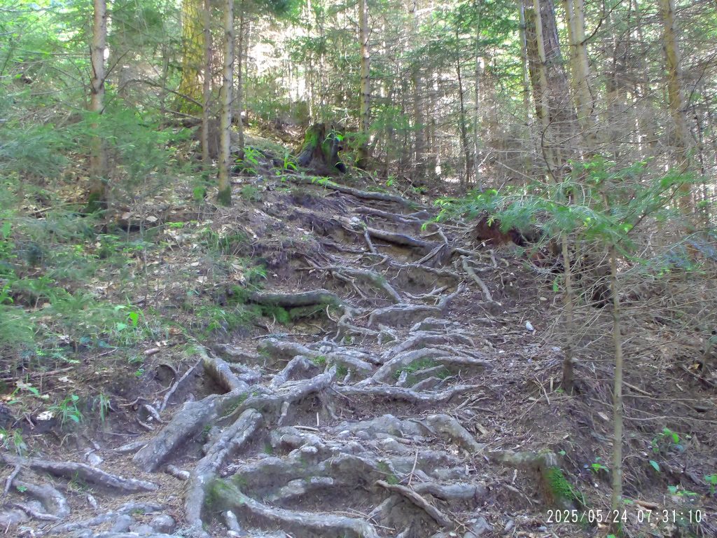 Markirana peš pot cesto preči, zato pa se začne strmo vzpenjati skozi strnjen gozd.