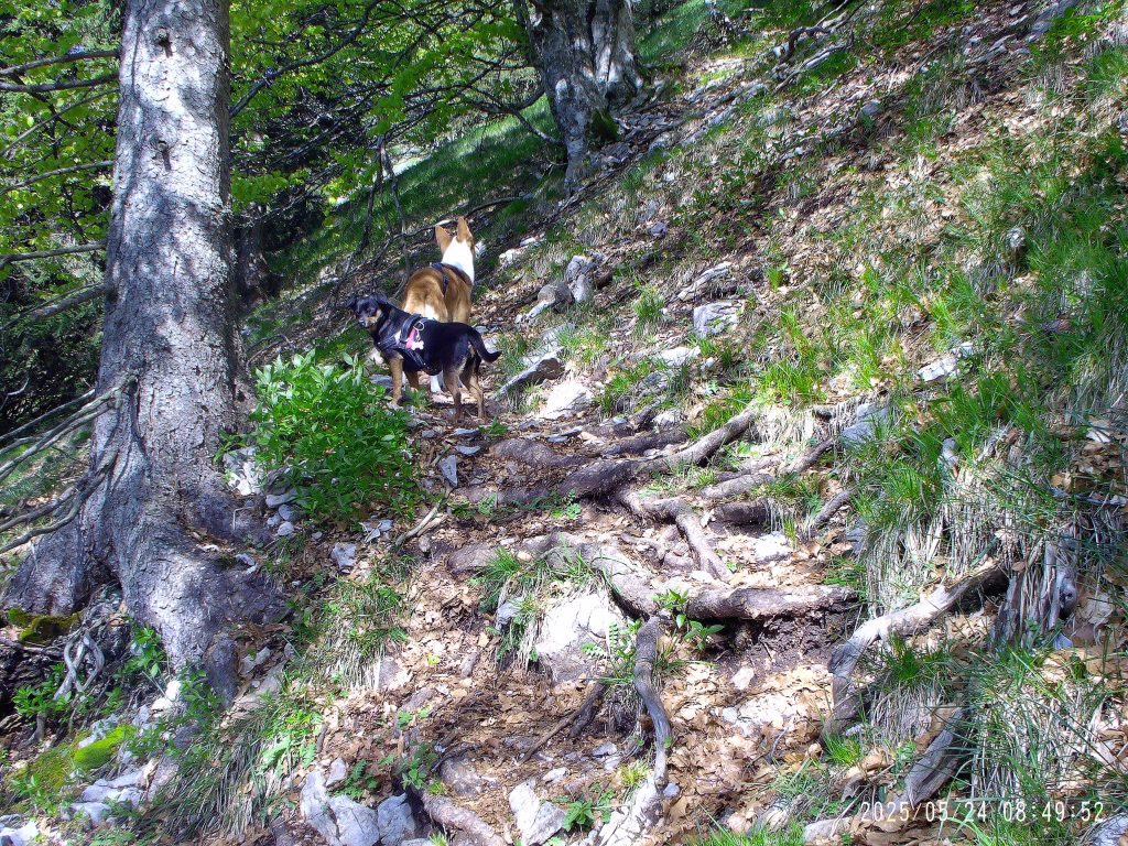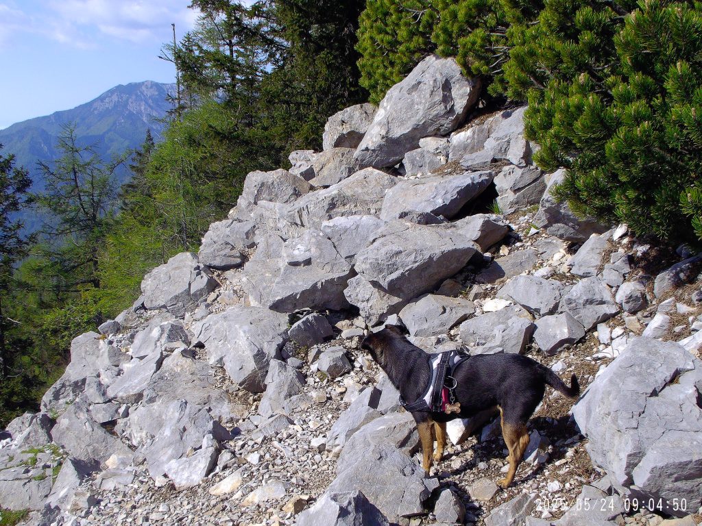 Višje nas je pot pripeljala na glavni greben, kjer smo šle levo. Strmina je popustila.