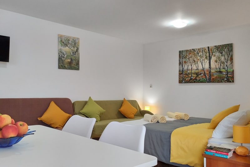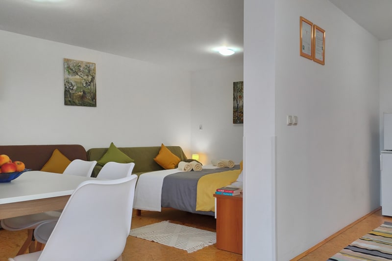 Družinski studio za do štiri goste in otroška posteljica, če je potrebno. Takojšen stik z naravo in čudovit razgled na vrt in okolico.