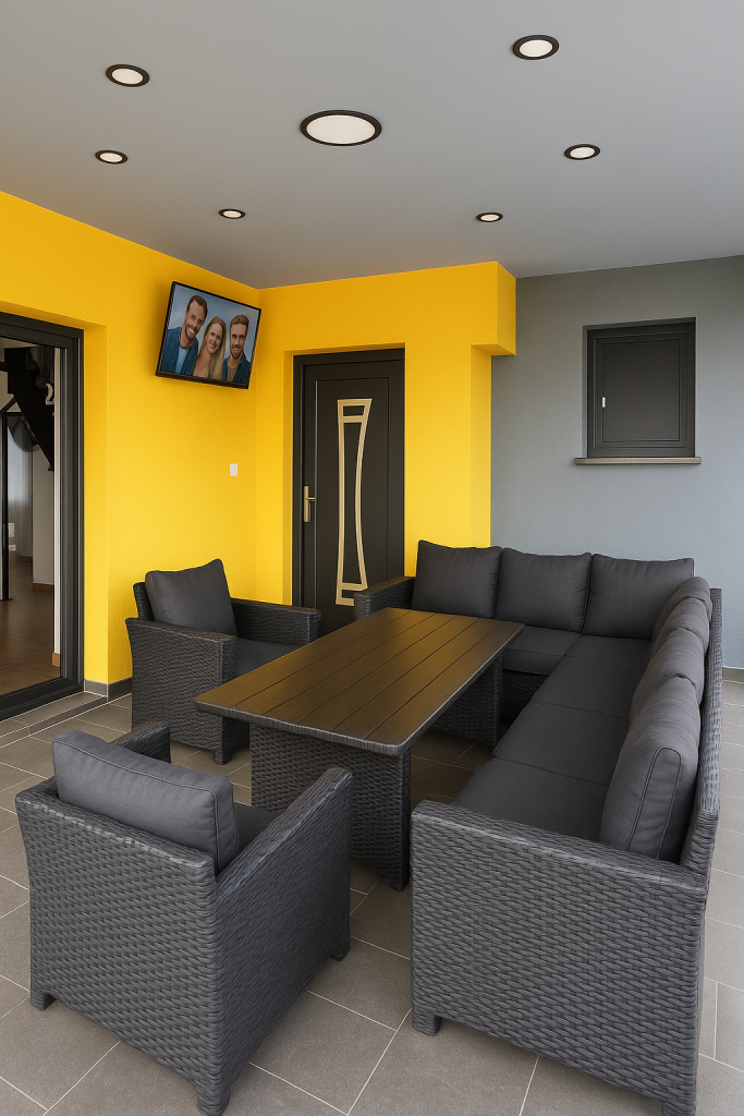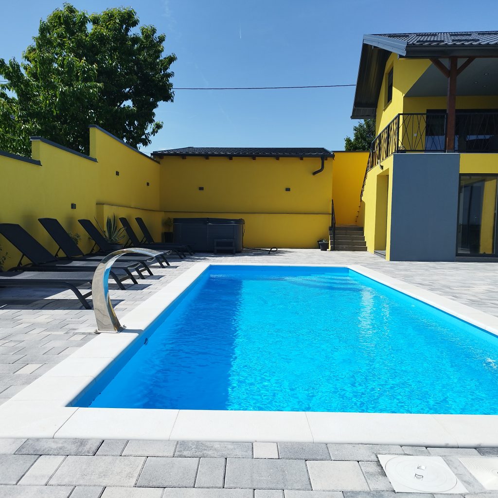 Celotno dvorišče je v celoti ograjeno z visoko in trdno ograjo, kar zagotavlja popolno varnost, zasebnost in mir. To je velika prednost posebej za goste s hišnimi ljubljenčki – psi lahko prosto tekajo, raziskujejo in se igrajo, vi pa ste lahko popolnoma brez skrbi, saj je prostor varen in popolnoma zaprt. Osrednji del zunanjosti je ogrevan bazen.